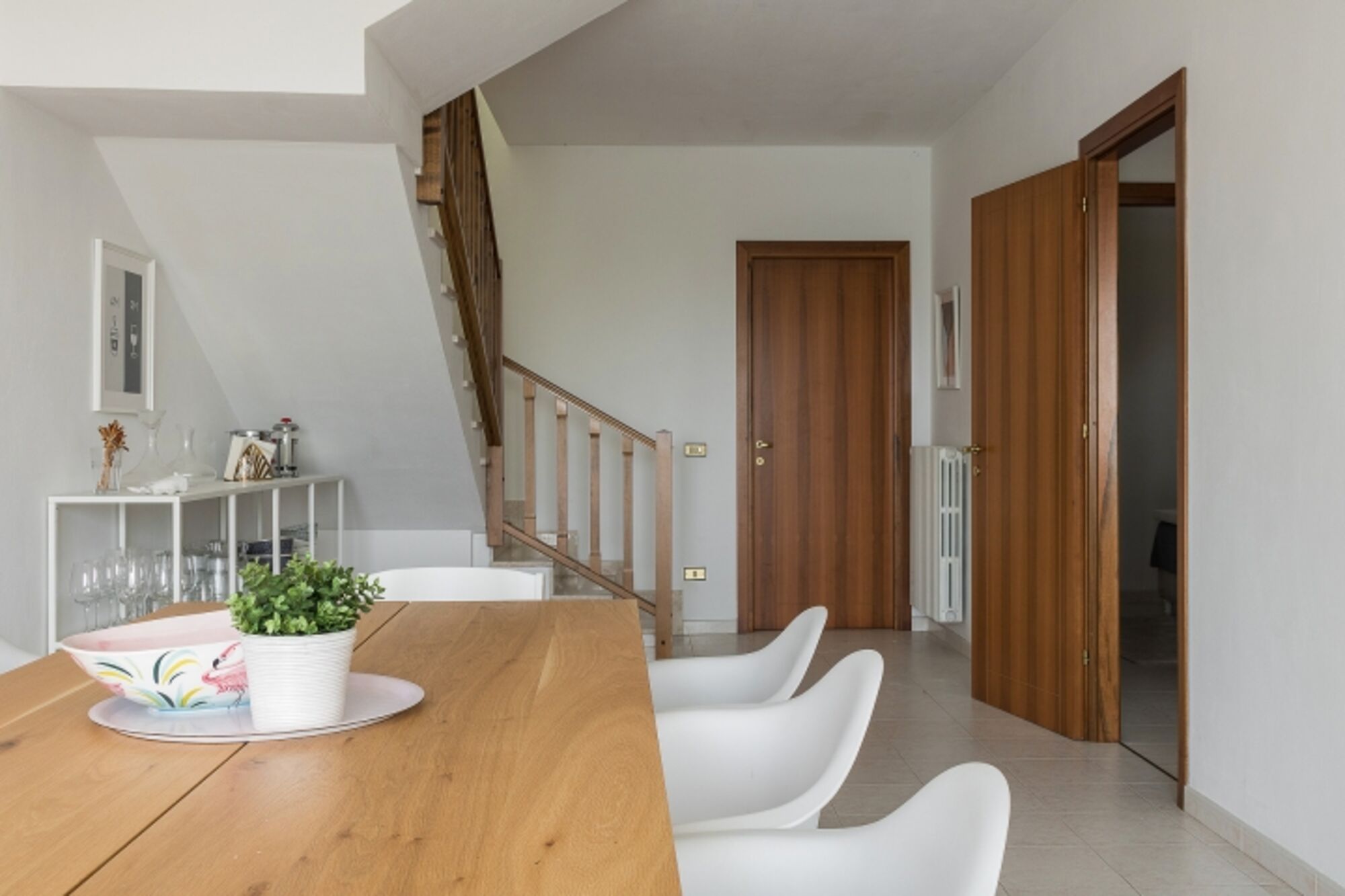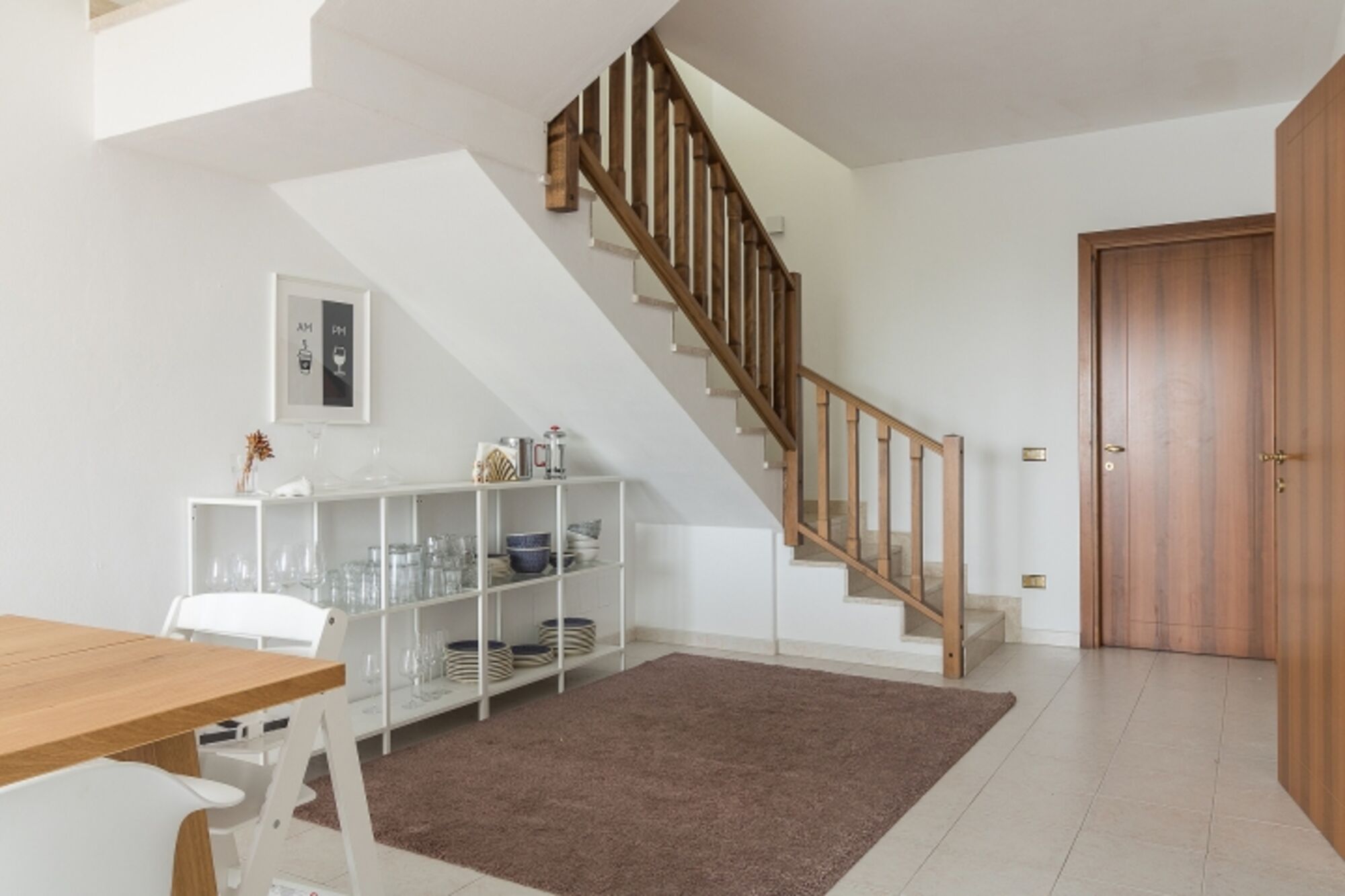 Die Villa ist auf 2 Ebenen aufgeteilt. Im Erdgeschoß findet man das Esszimmer mit Küche, zwei Schlafzimmer und ein Bad mit Dusche. Von hier aus gelangen Sie in den Wohnbereich mit Panoramablick auf den See und auf die geräumige, möblierte Terrasse, auf der Sie angenehme Momente der Entspannung genießen können. Im oberen Stockwerk finden Sie ein Schlafzimmer und ein Bad mit Dusche.