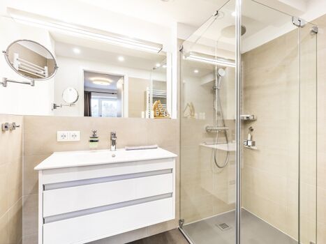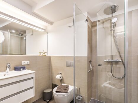 Badezimmer 1: Beginnen Sie den Tag in der eleganten Atmosphäre dieses Badezimmers mit Regendusche, WC und einem Haartrockner.