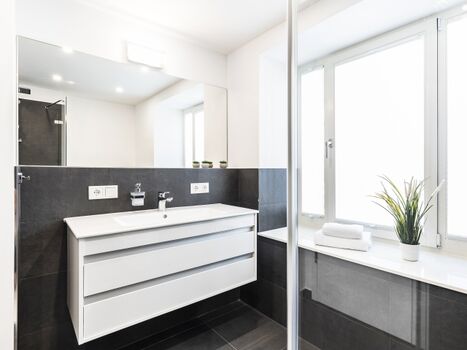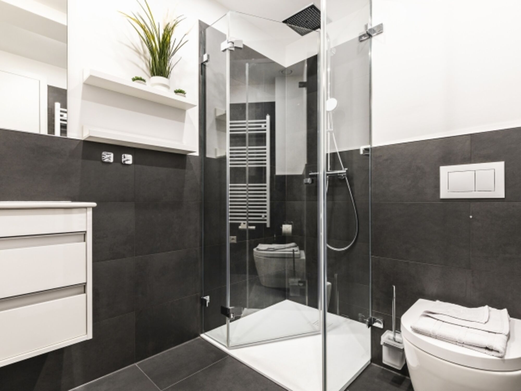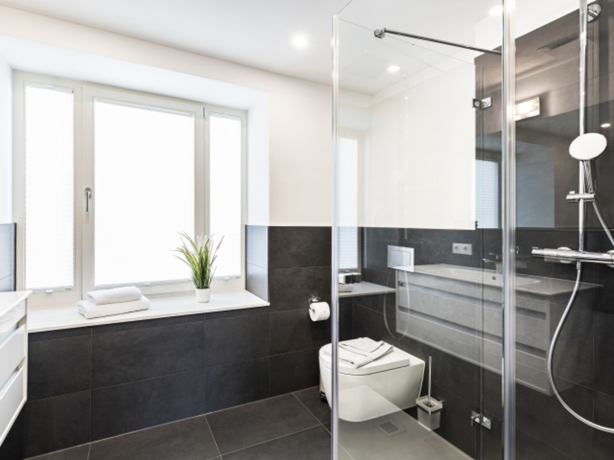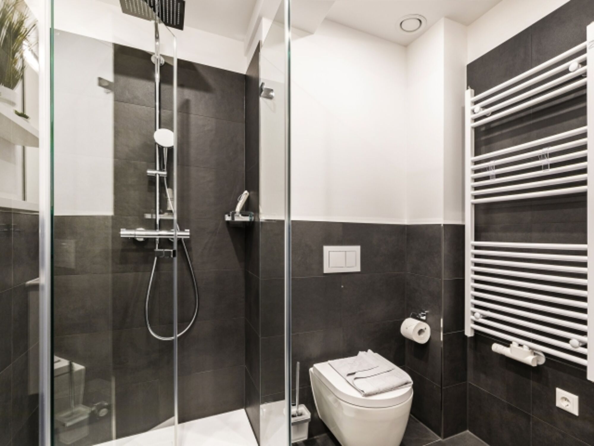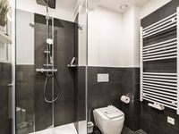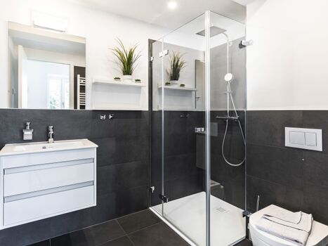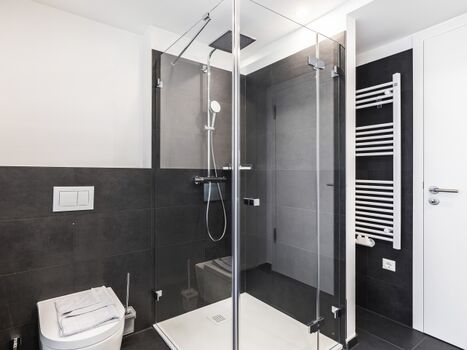 Badezimmer 2: Ein zweites stilvolles Badezimmer mit einer Regendusche, WC und einem Haartrockner.