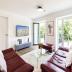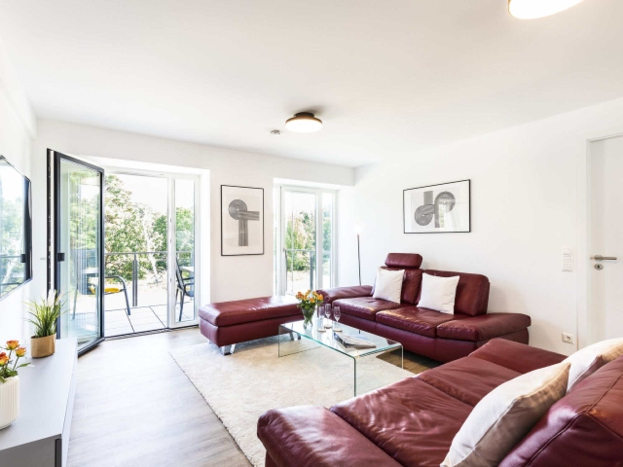 Wohnzimmer: Der großzügige Wohnraum verfügt über zwei gemütliche Sofas, einen TV und einen Zugang zu Ihrem eigenen Balkon.
