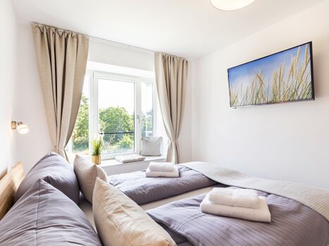 Schlafzimmer 2: Ein charmantes Schlafzimmer mit zwei komfortablen Einzelbetten (90x200), einem TV und einem geräumigen Kleiderschrank.