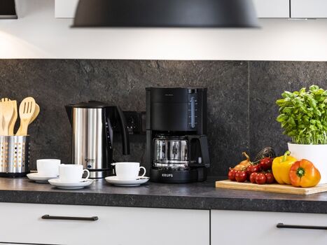 Vollausgestattete Küche: Die moderne Küche ist komplett ausgestattet, einschließlich einer Kaffeemaschine mit Filter.