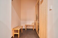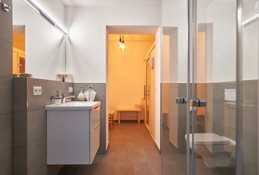 Badezimmer 1: Moderne Annehmlichkeiten erwarten Sie in diesem Badezimmer mit Dusche, WC und sogar einer eigenen Sauna für pure Entspannung.