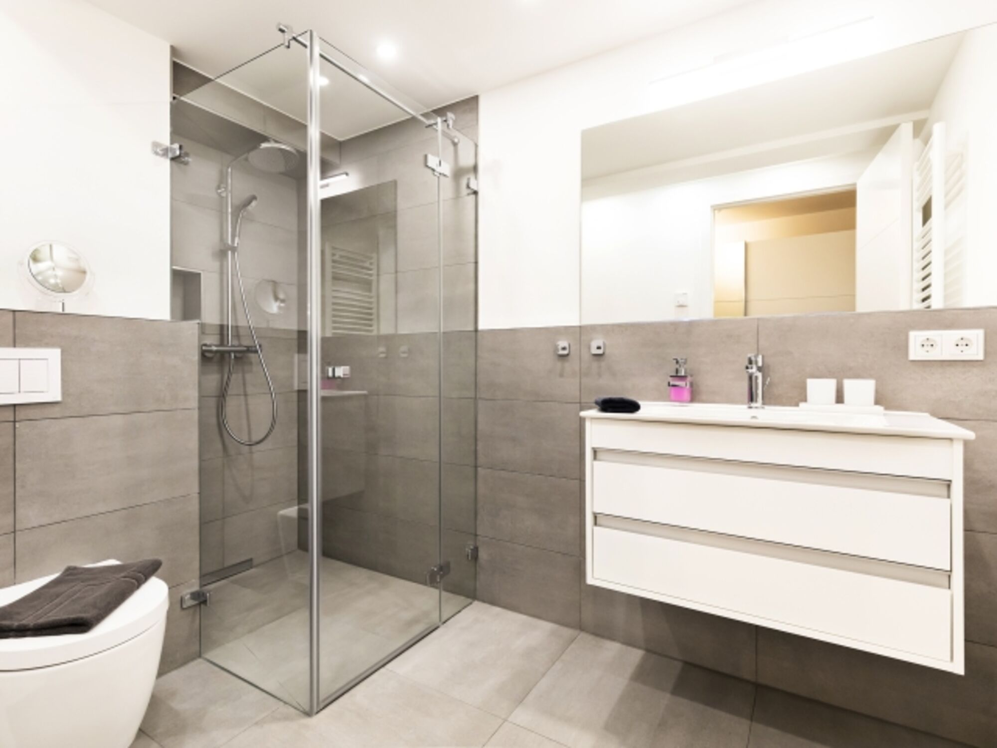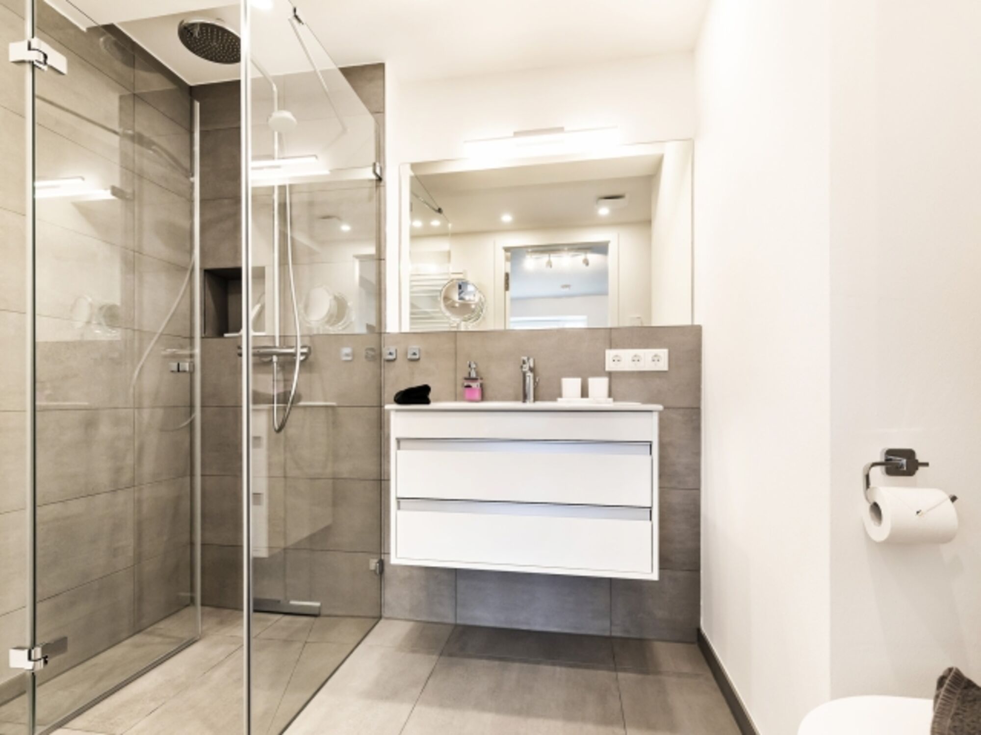 Waschbecken, Regendusche, Spiegel