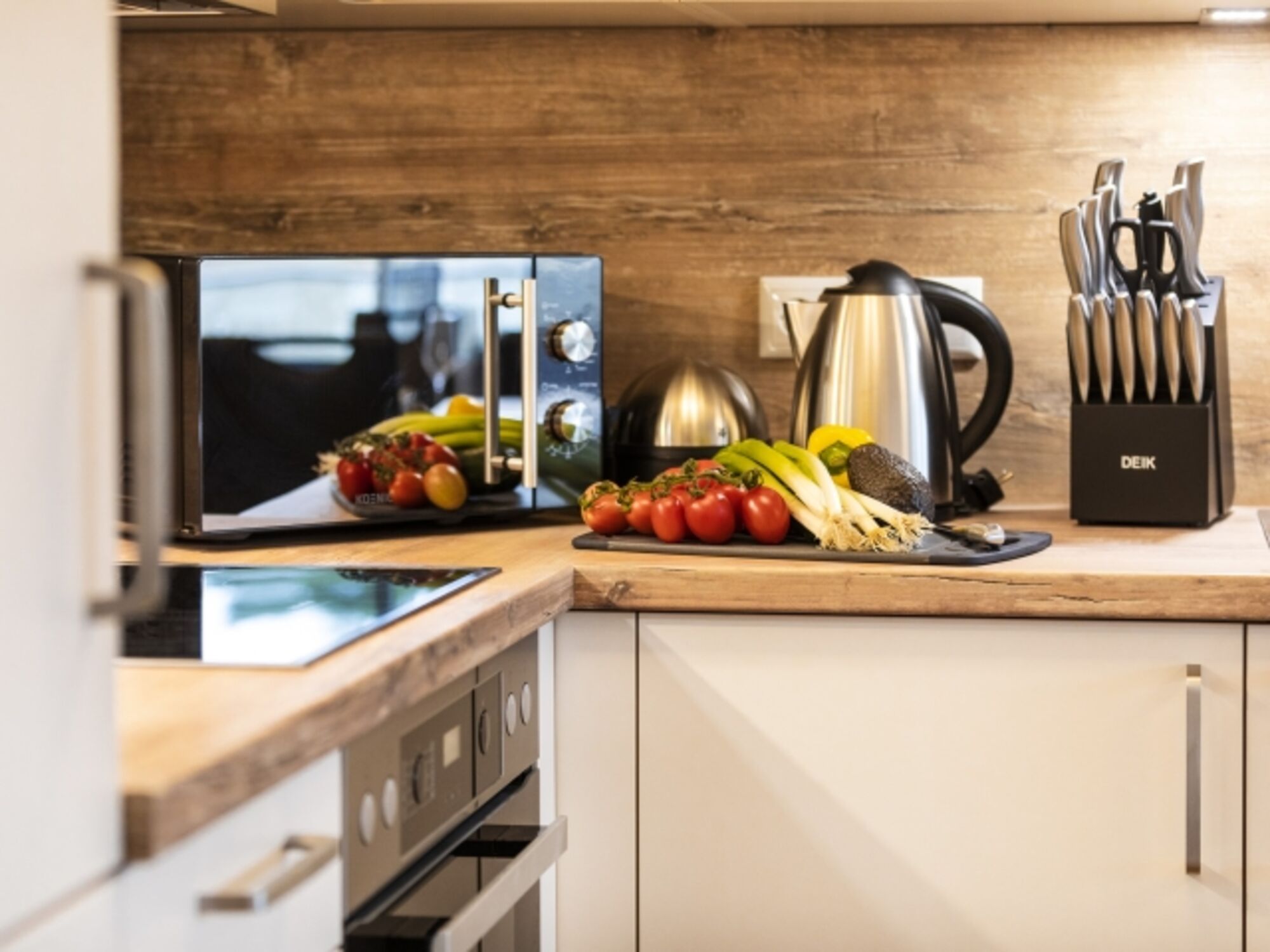 4-Platten Herd, Cerankochfeld, Dunstabzugshaube, Kühlschrank mit Gefrierfach, Geschirrhandtücher