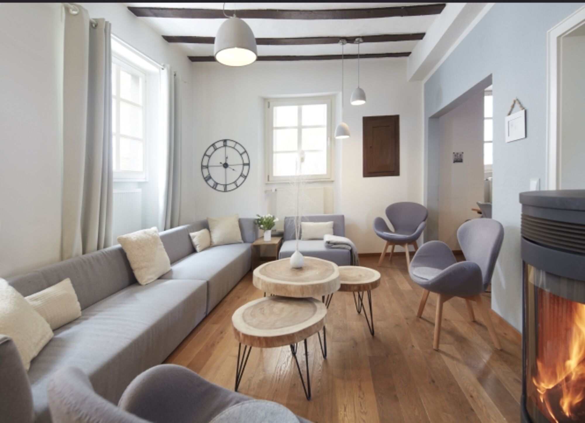 Das Wohnzimmer mit dem großen Sofa, mehreren Sesseln und dem Kaminofen bietet Ihnen eine Atmosphäre zum Wohlfühlen.