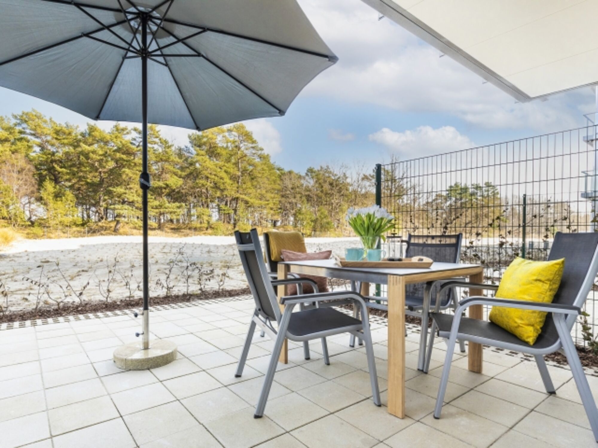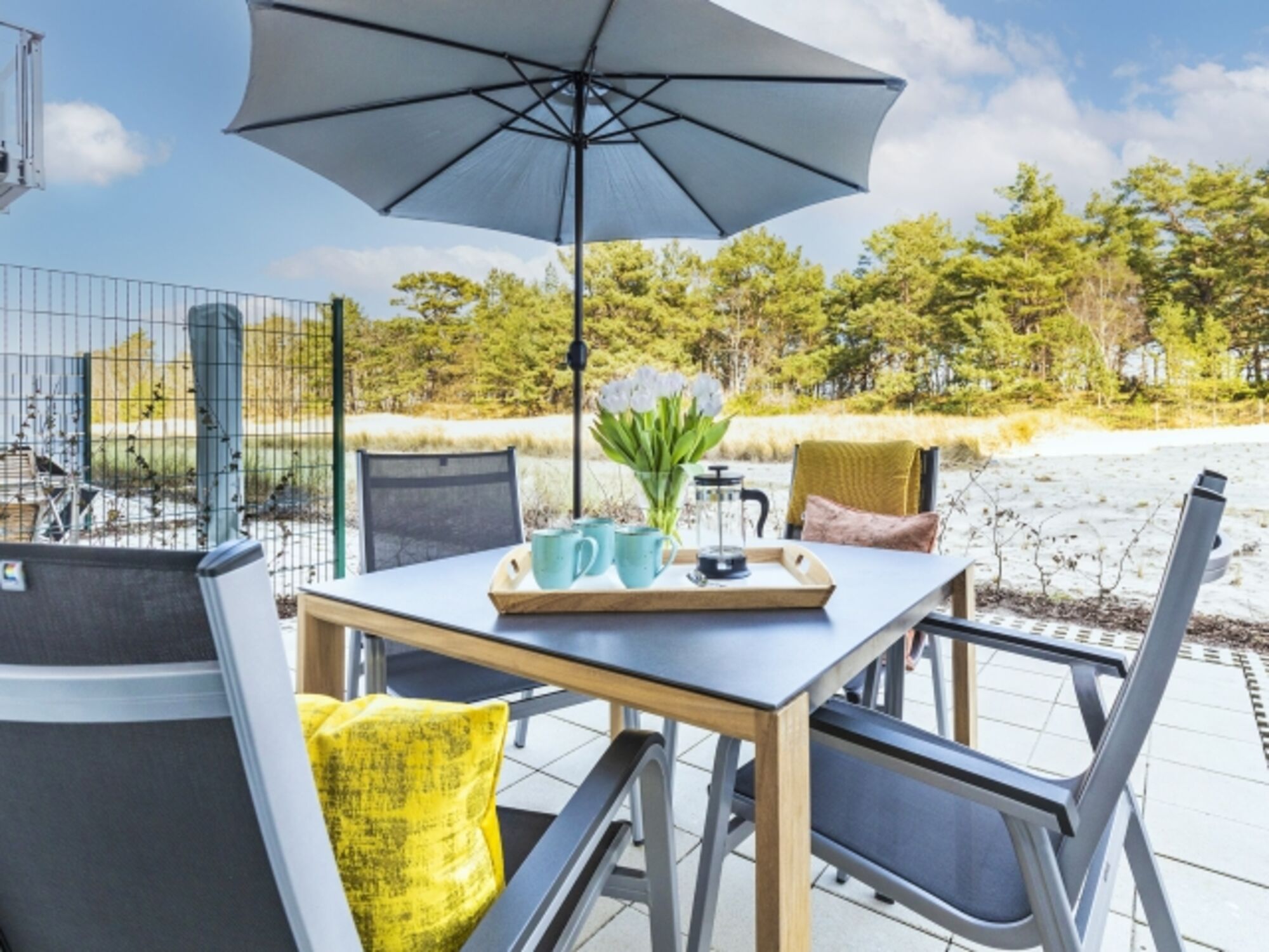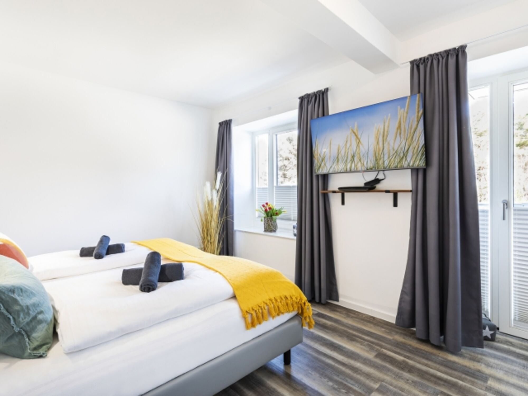 In der geräumigen Wohnung finden bis zu 4 Personen bequem Platz. Die beiden Schlafzimmer verfügen über komfortable Doppelbetten, während das Schlafsofa im Wohn- und Essbereich eine zusätzliche Schlafmöglichkeit bietet. Der Balkon und die Terrasse bieten herrliche Ausblicke auf die Dünenlandschaft und laden zum Entspannen ein.