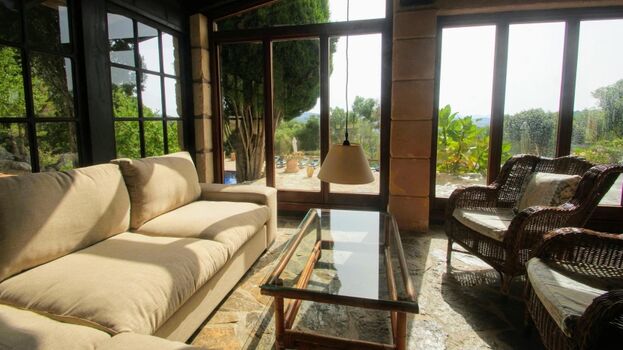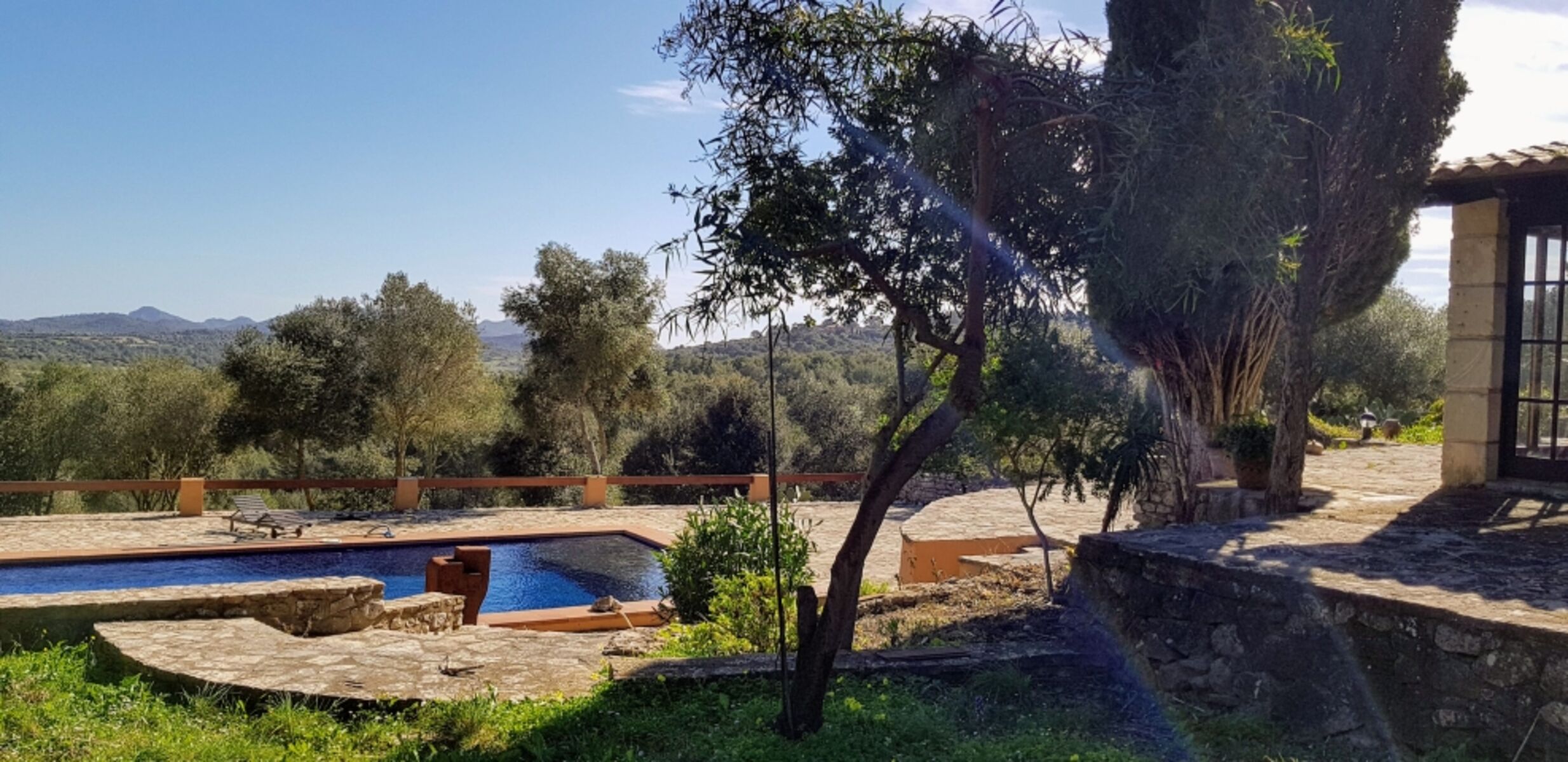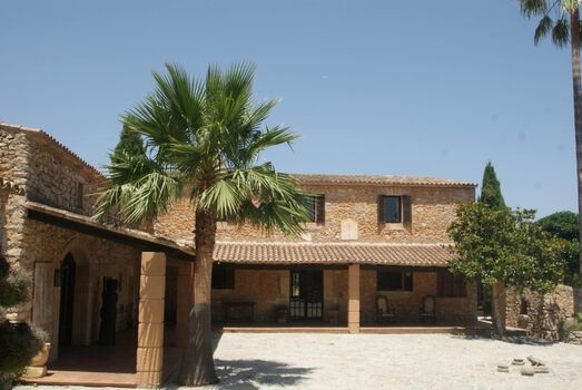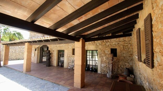 Die Außenbereiche bieten zahlreiche Rückzugsmöglichkeiten: eine Veranda rund um den Hof, weitläufige Terrassen und einen Pool mit traumhaftem Blick über das Tal bis hin zum etwa 20 Kilometer entfernten Canyamel. Dank der Alleinlage gibt es keine direkten Nachbarn – ideal, wenn Ihr Hund Freiheit genießen soll. Das nächste bewohnte Haus liegt rund 500 Meter entfernt.
