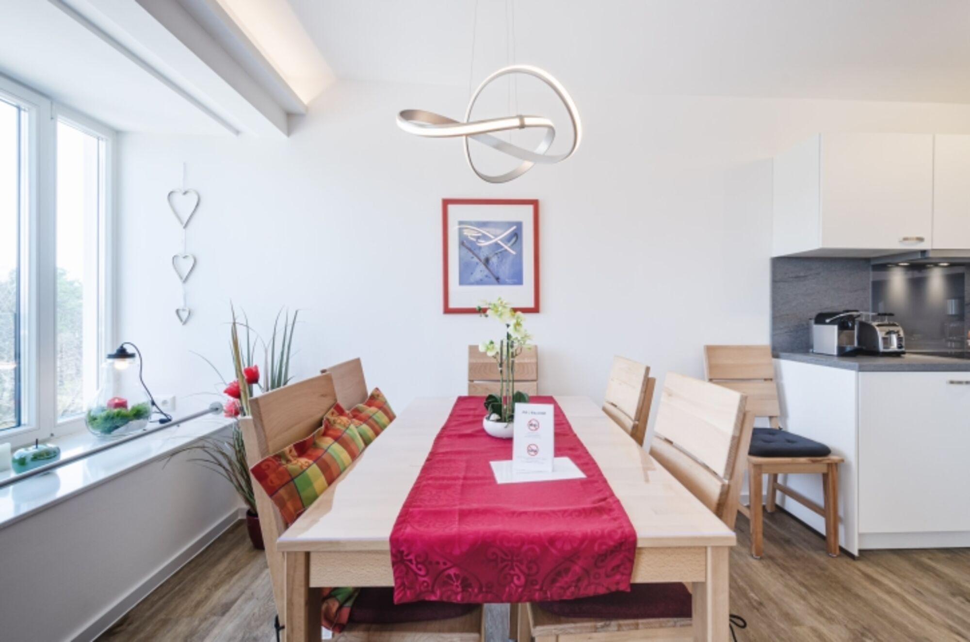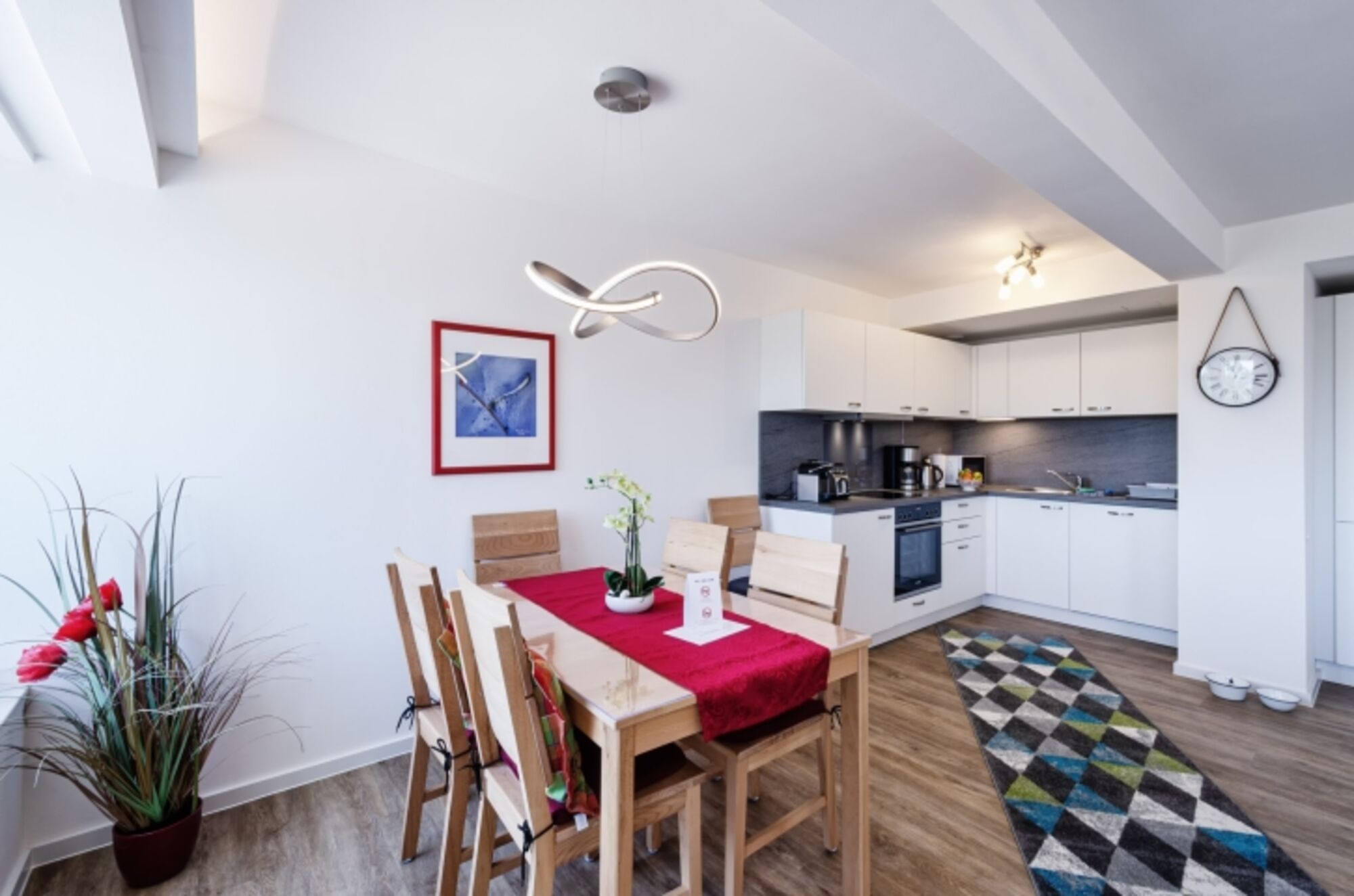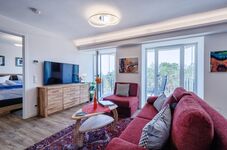 Dieses geschmackvoll eingerichtete 2-Zimmerapartment mit modernen Farbakzenten verfügt über einen großzügigen Wohn-Essbereich mit offener Küche. Hier gibt es auch eine Schlafcouch, die einer dritten Person bequem Platz bietet, ohne Raum einzuschränken. Für unsere vierbeinigen Gäste steht sogar ein gemütliches Hundeschlafbett bereit.
