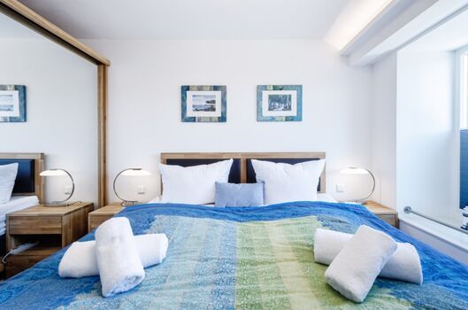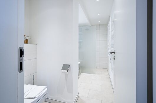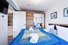 Das Schlafzimmer ist mit einem komfortablen Boxspringbett für zwei Personen ausgestattet und bietet die ideale Atmosphäre für einen erholsamen Schlaf. Das Badezimmer verfügt über eine bodengleiche Dusche mit Regenduschkopf, einen Handtuchwärmer und alle Annehmlichkeiten eines modernen Badezimmers.