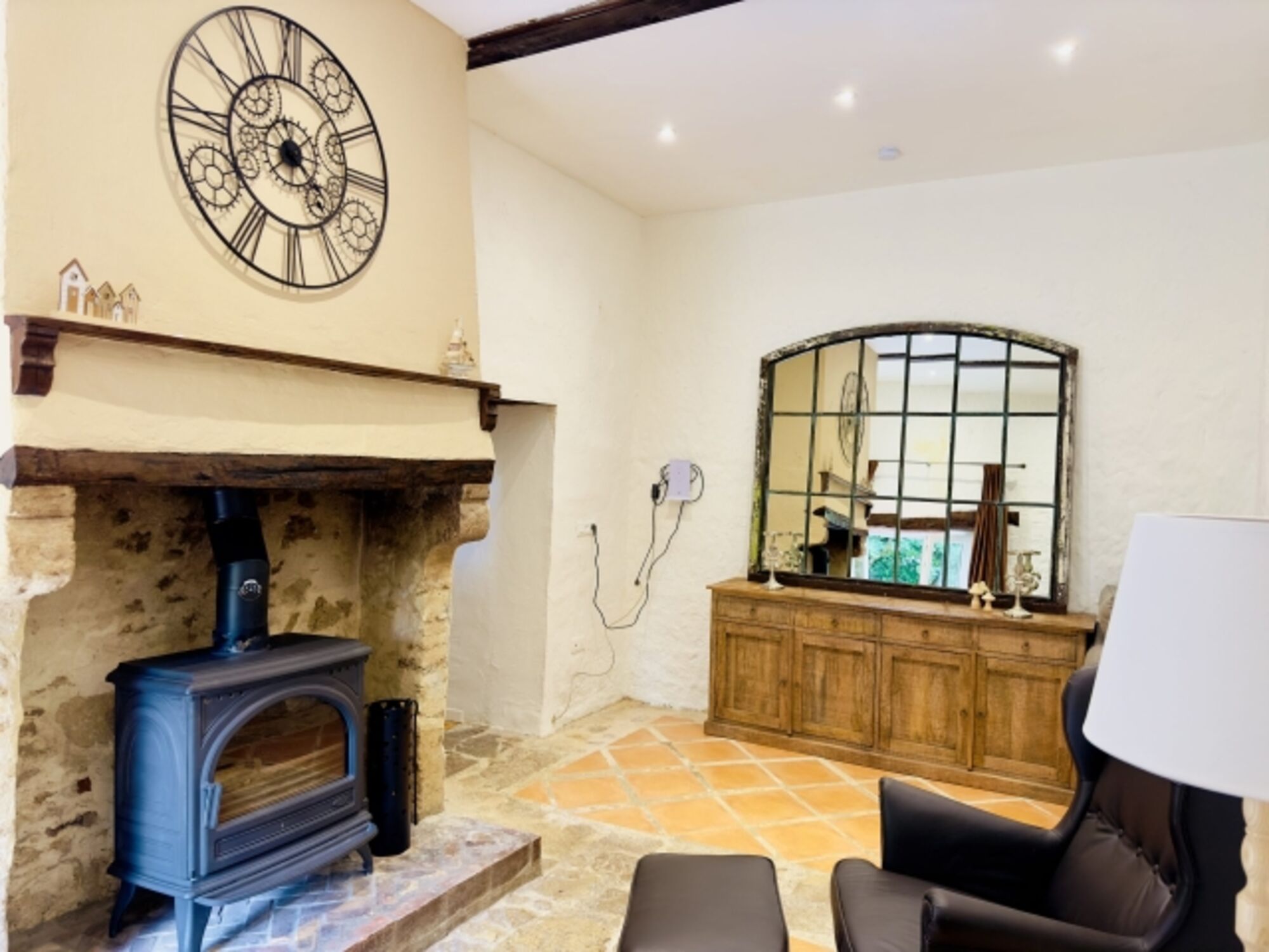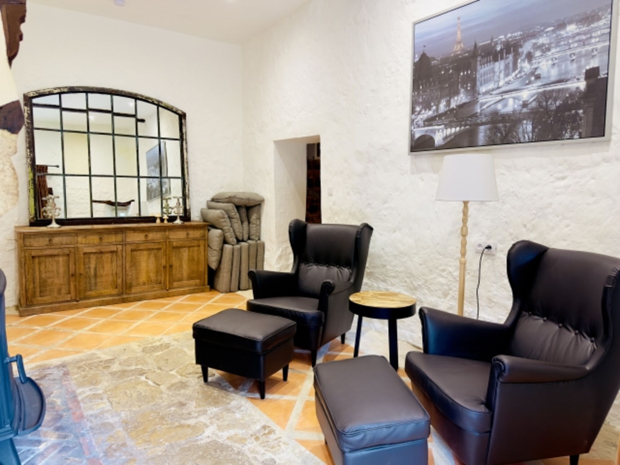 TV-Sat, SMART-TV, HDTV Flachbildschirm, Blu-Ray-Player, DVD bzw. Blu-Ray-Filme, Hi-Fi-Anlage mit Bluetooth, Bücher, Kaminofen, 3er-Sofa, Sessel
