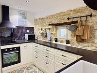 Induktionsherd, Dunstabzugshaube, Kühlschrank mit Gefrierfach, Senseo-Kaffeeautomat, Küchenmaschine, Korkenzieher / Flaschenöffner, Gewürze (Salz, Pfeffer, Zucker), Öl / Essig, Geschirrhandtücher, Mülltüten, Essplatz in der Küche