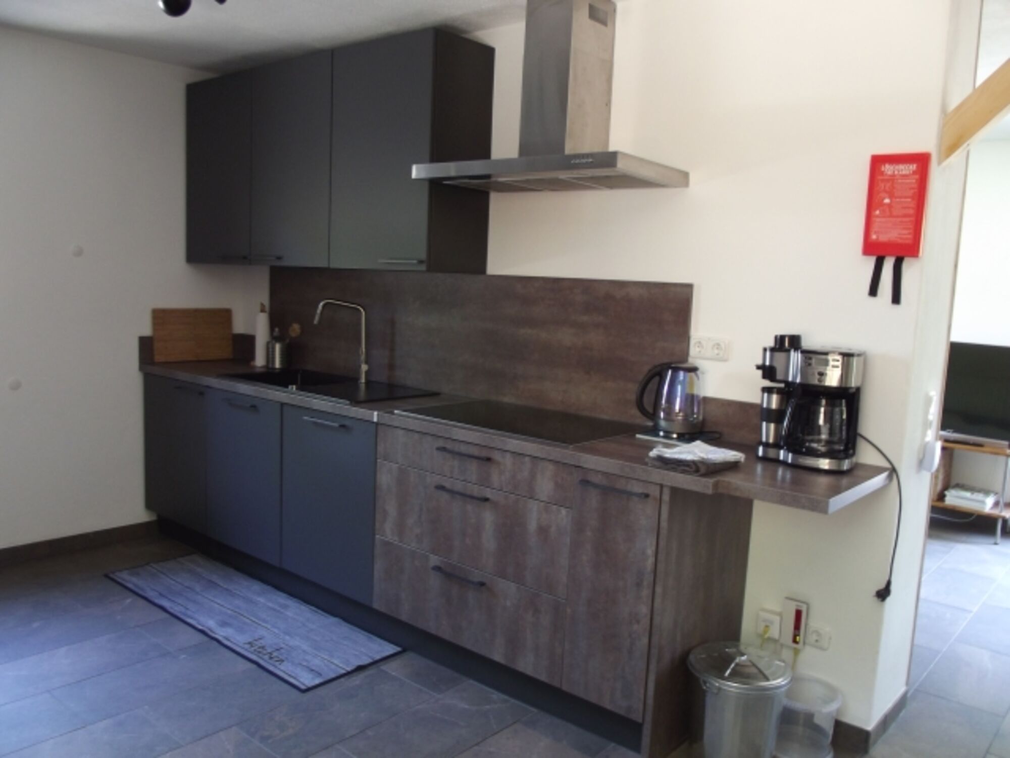 Cerankochfeld, Induktionsherd, Dunstabzugshaube, Gefrierschrank, Eierkocher, Mixer, Waffeleisen, Korkenzieher / Flaschenöffner, Gewürze (Salz, Pfeffer, Zucker), Geschirrhandtücher, Mülltüten