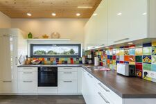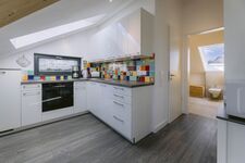 Cerankochfeld, Kühlschrank mit Gefrierfach, Korkenzieher / Flaschenöffner, Essplatz in der Küche