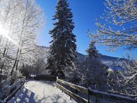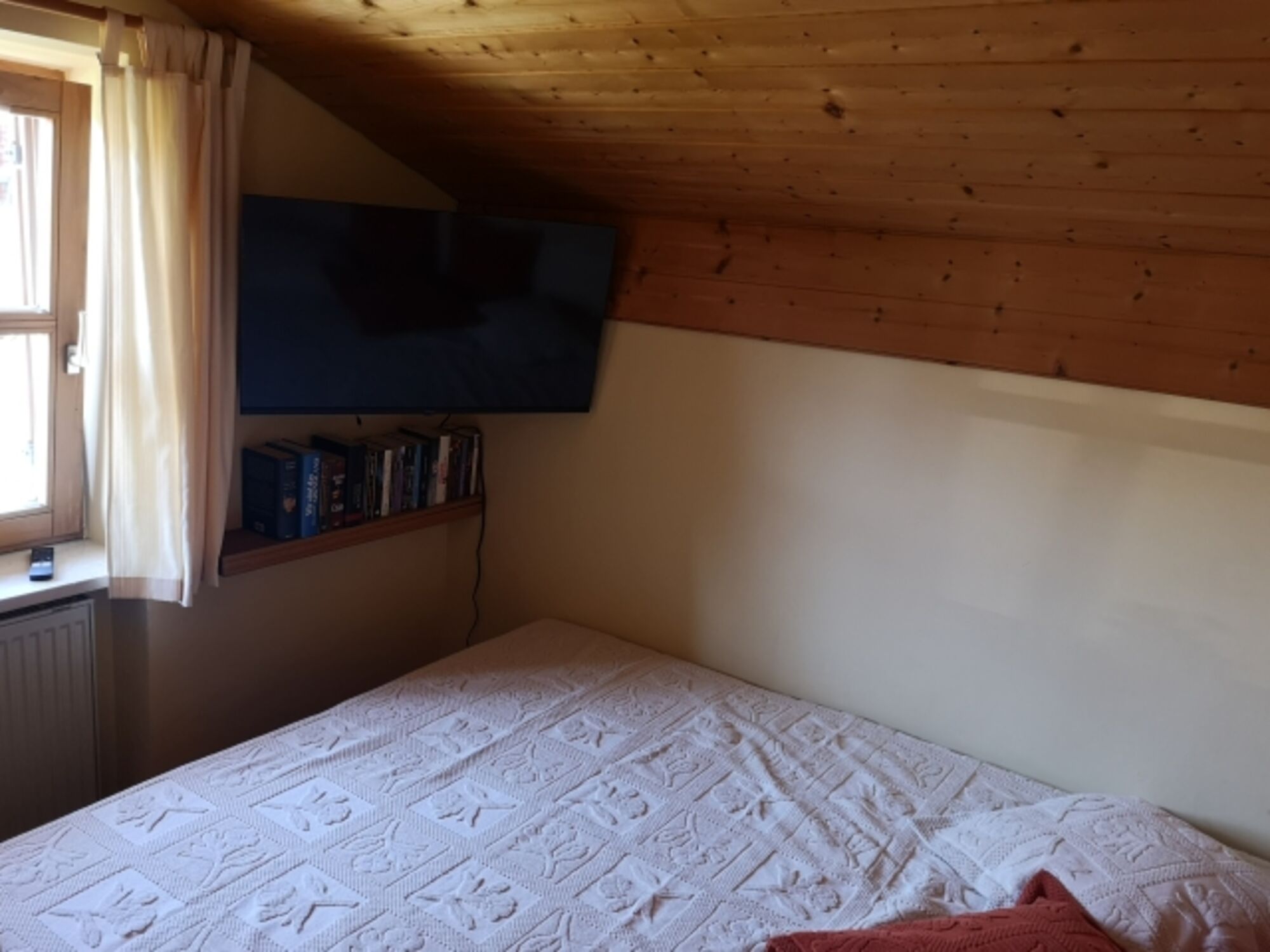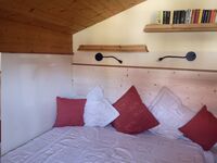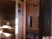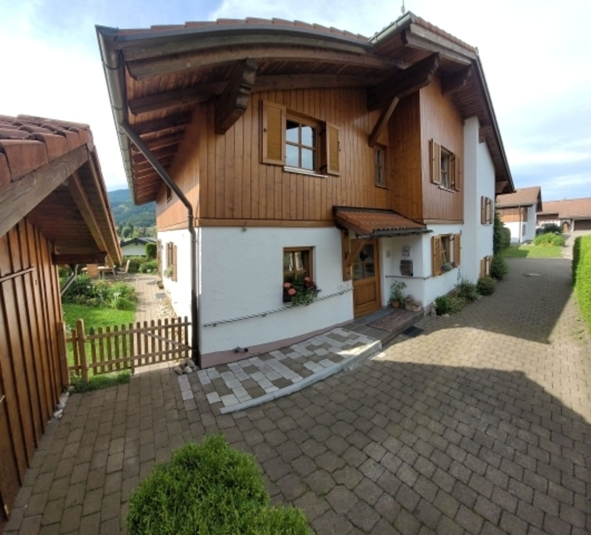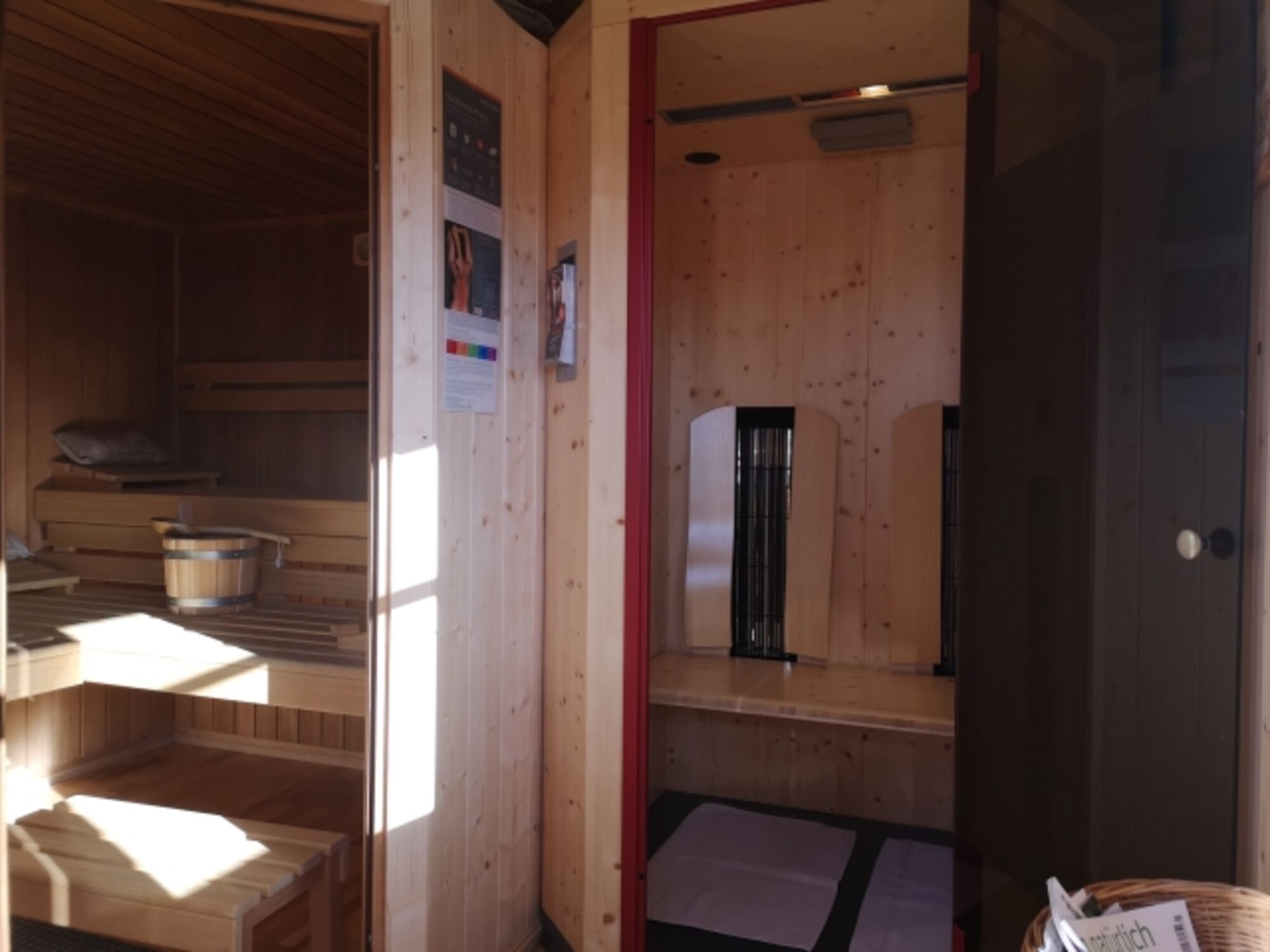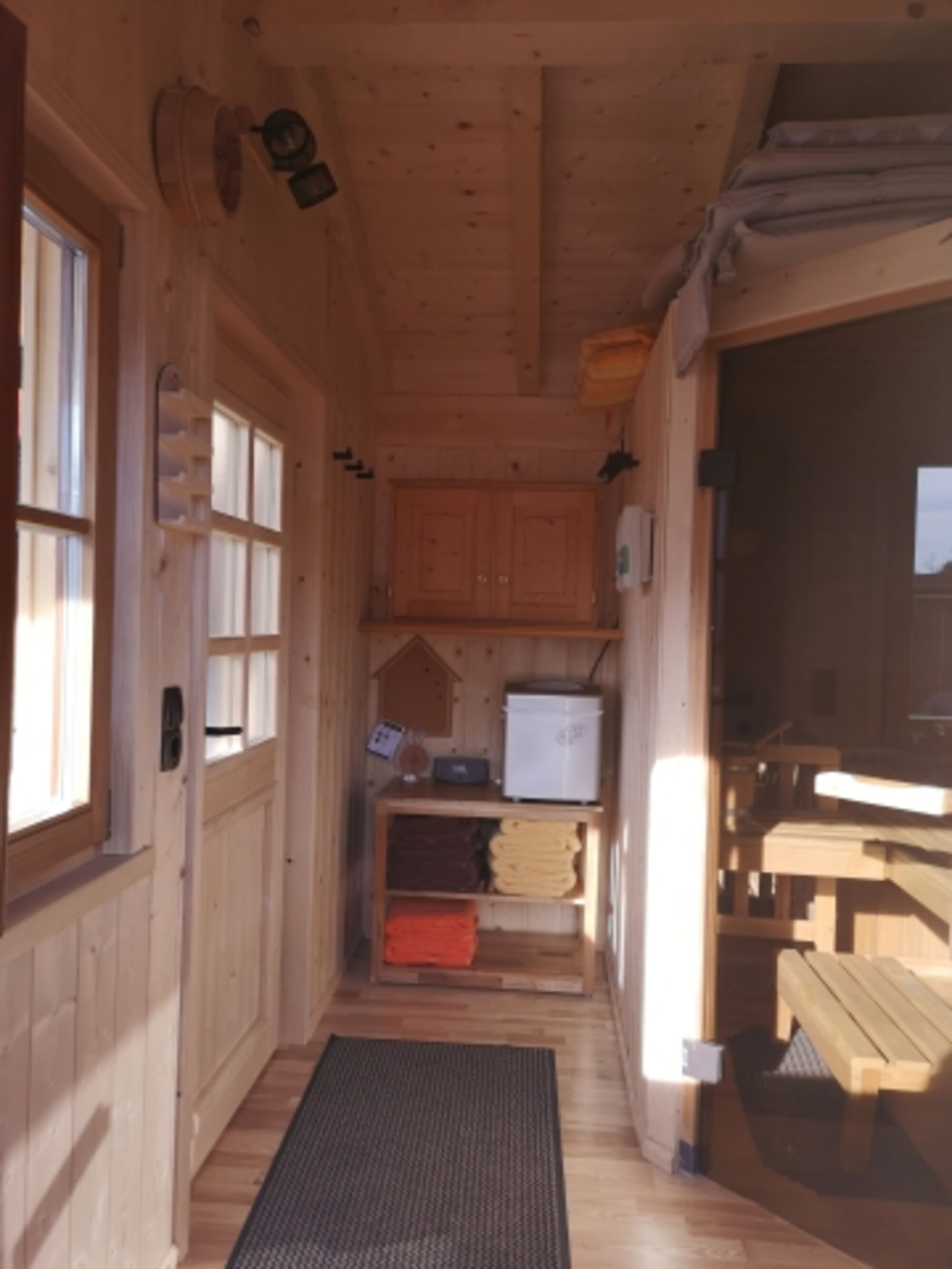 Das barrierefreie Duschbad/WC und die beiden Schlafzimmer befinden sich in der 1. Etage. Das Erdgeschoss verfügt über ein Gäste-WC, eine komplett ausgestattete separate Küche und ein Wohnzimmer mit Essecke und Kamin. Die Terrassentür führt direkt in den großen, komplett eingezäunten Garten mit dem neuen Saunagartenhäuschen, das im Dezember 2025 fertig gestellt wurde. Dieses Gartenhäuschen beherbergt eine Klafs Sauna (max. 4 Pers.) und eine Physiotherm Infrarotkabine (max. 2 Pers.) Auch während der Saunadurchgänge genießt Ihr den schönen Bergblick, der zu jeder Jahreszeit für Entspannung und Erholung sorgt. Das Tauchbecken steht selbstverständlich auch zum gesunden Eisbaden zur Verfügung.