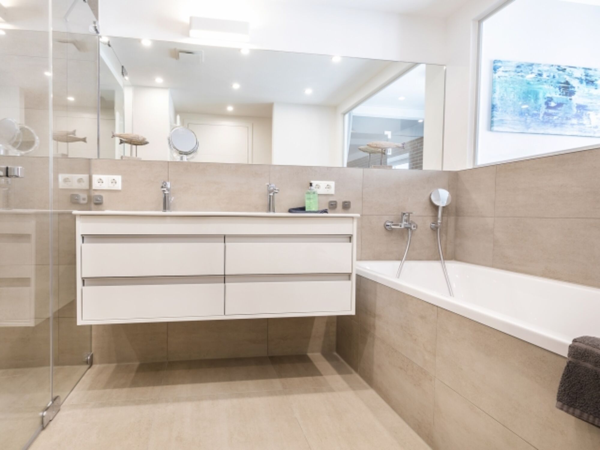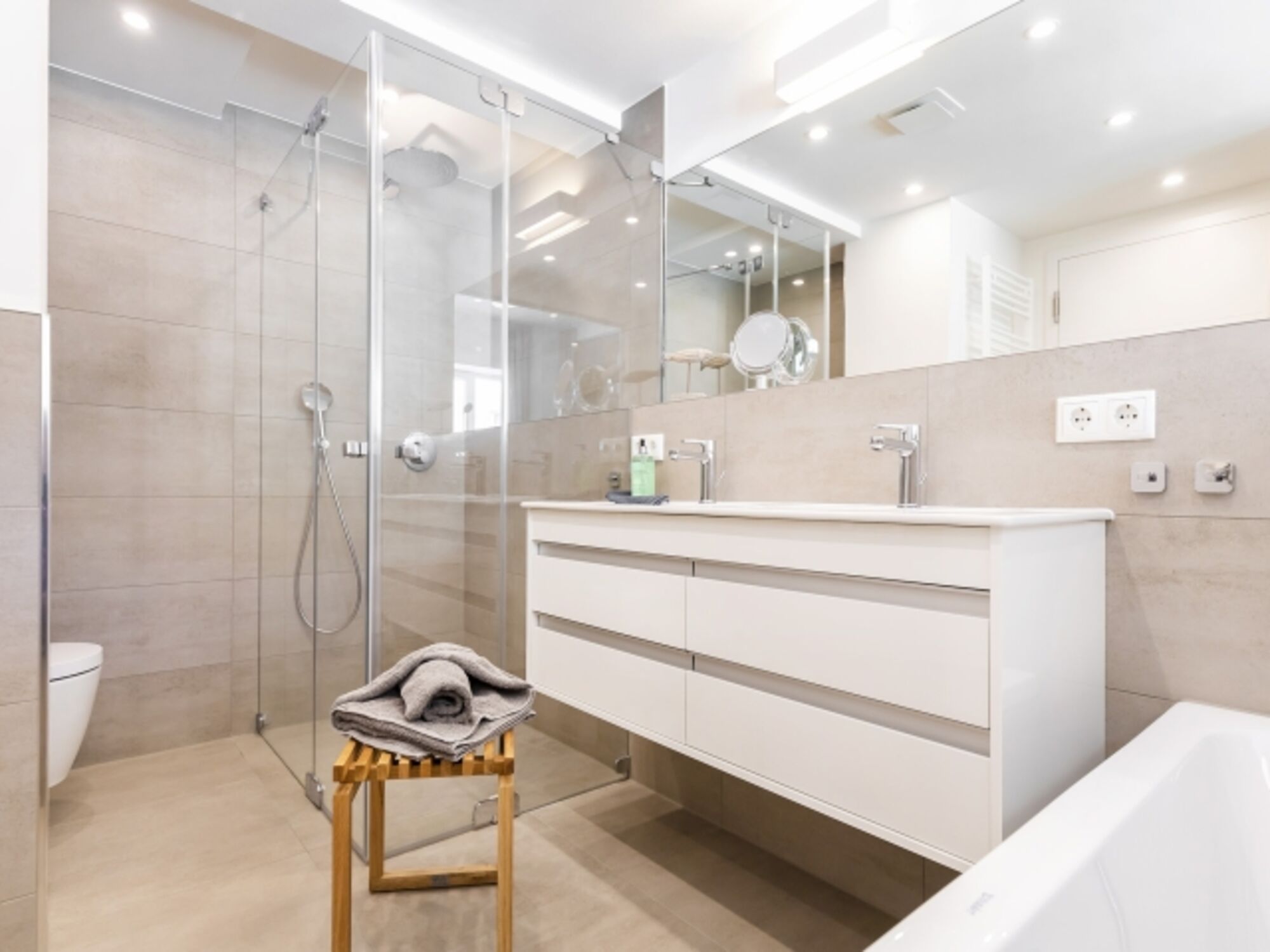 Die beiden Badezimmer sind komfortabel ausgestattet, eines mit einer erfrischenden Dusche und einer Infrarotsauna, das andere mit einer entspannenden Badewanne.
