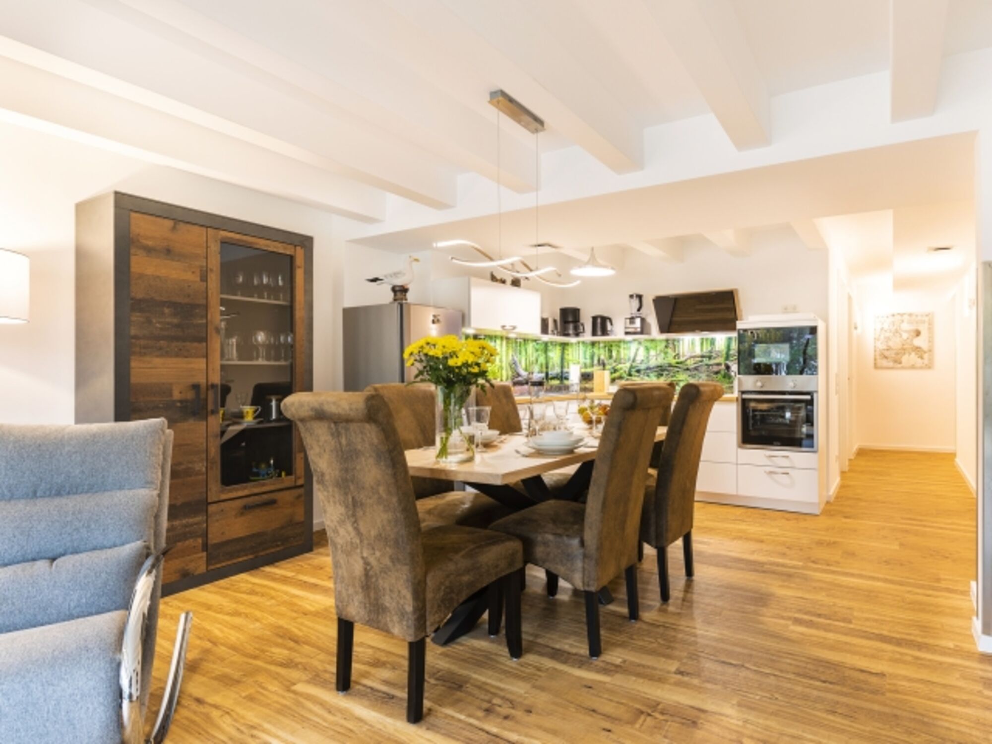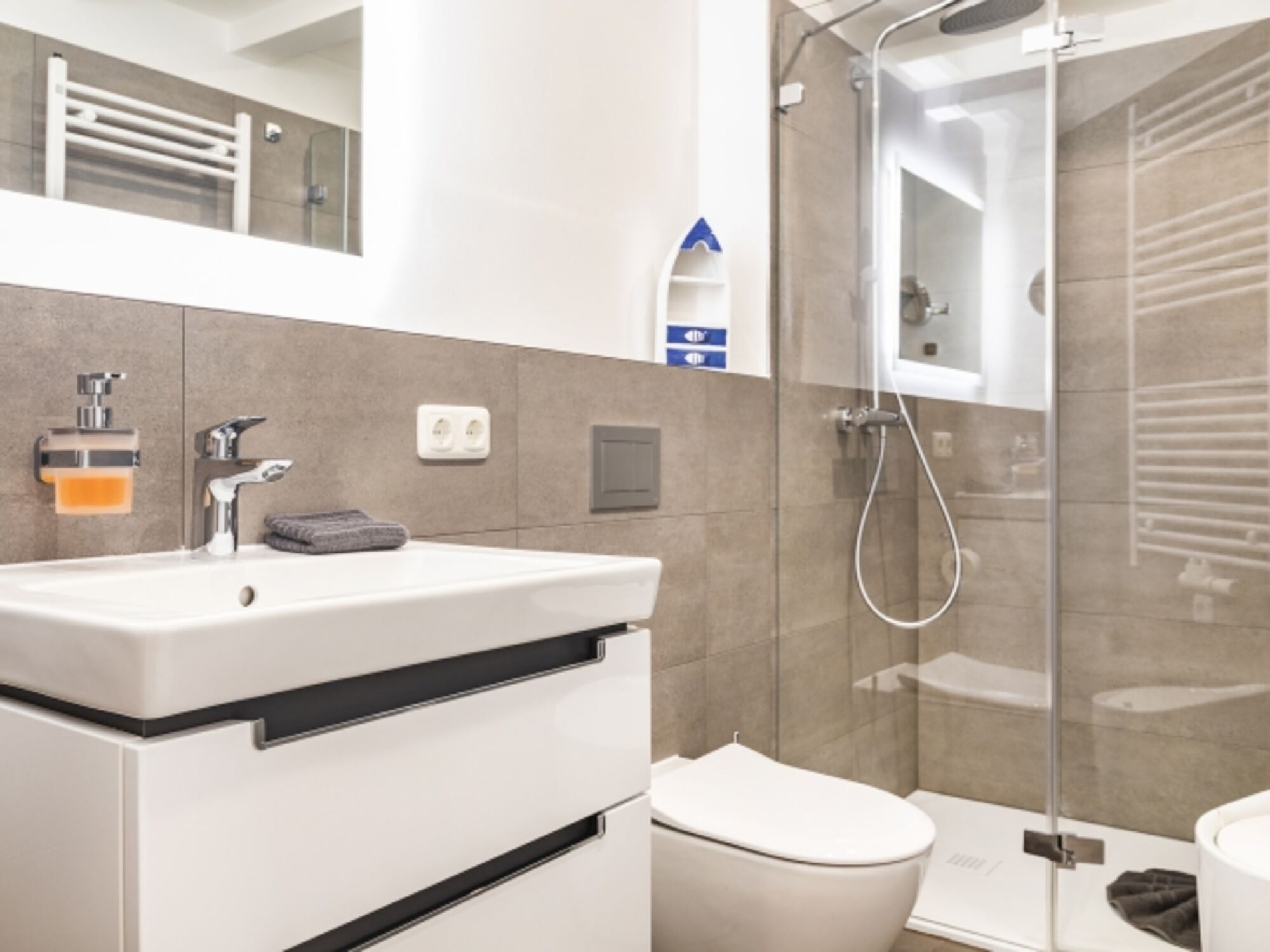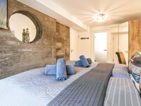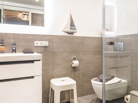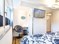 Damit eignet sich das Apartment auch hervorragend für Familien und Gruppen mit bis zu 6 Personen. Die Kinder werden sich besonders über den feinsandigen Strand freuen, der zum Buddeln und Sandburgen bauen einlädt. Ihre Strandutensilien können Sie bequem mit einer Transportkarre zum Strand transportieren, Getränke bleiben in einer Kühltasche angenehm kühl. In direkter Nähe der Wohnung befindet sich ein Hochseilgarten, ein großer und moderner EDEKA-Markt, ein Fahrradverleih sowie diverse Restaurants und Läden. In der Wohnung selbst stehen einige Brettspiele, Bücher und auch Spiele für draußen zur Verfügung. Sollten Sie während Ihres Aufenthalts Ihre Wäsche waschen wollen, werden Sie sich über eine Waschmaschine in der Abstellkammer im selben Stockwerk freuen. Kostenfreier WLAN-Zugang ist ebenso selbstverständlich vorhanden wie Steckdosensicherungen der bodennahen Steckdosen. Hunde sind herzlich willkommen und freuen sich über ein Hundebett, eine kleine Hundebox, diverse Näpfe und einen Hundestrand in direkter Nähe.