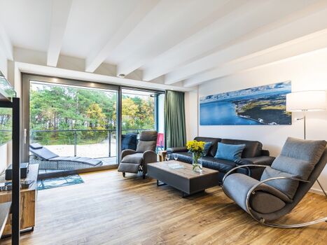 Vom Sofa oder Balkon den Blick auf die Dünenlandschaft und zum blaugrünen Meer genießen und damit direkt in die Urlaubserholung starten. Durch die bodentiefen Fenster in Raumbreite erfüllt die Ferienwohnung "Loft Sturmmöwe" an der Prorer Wiek, diesen und auch alle anderen Urlaubswünsche für einen wunderschönen Aufenthalt am Meer. Sie logieren in einem traumhaft gestalteten Apartment an der Ostküste Rügens. Mit nur wenigen Schritten sind Sie am Meer und an einem der schönsten Sandstrände Deutschlands, dessen Sand karibisch weiß ist. Vor den Wohnungen erstreckt sich eine wunderschöne Gartenlandschaft mit einheimischer Flora und Fauna. Ein kleiner Kiefernwald schirmt Sie vom Strand ab und sorgt für Privatsphäre.