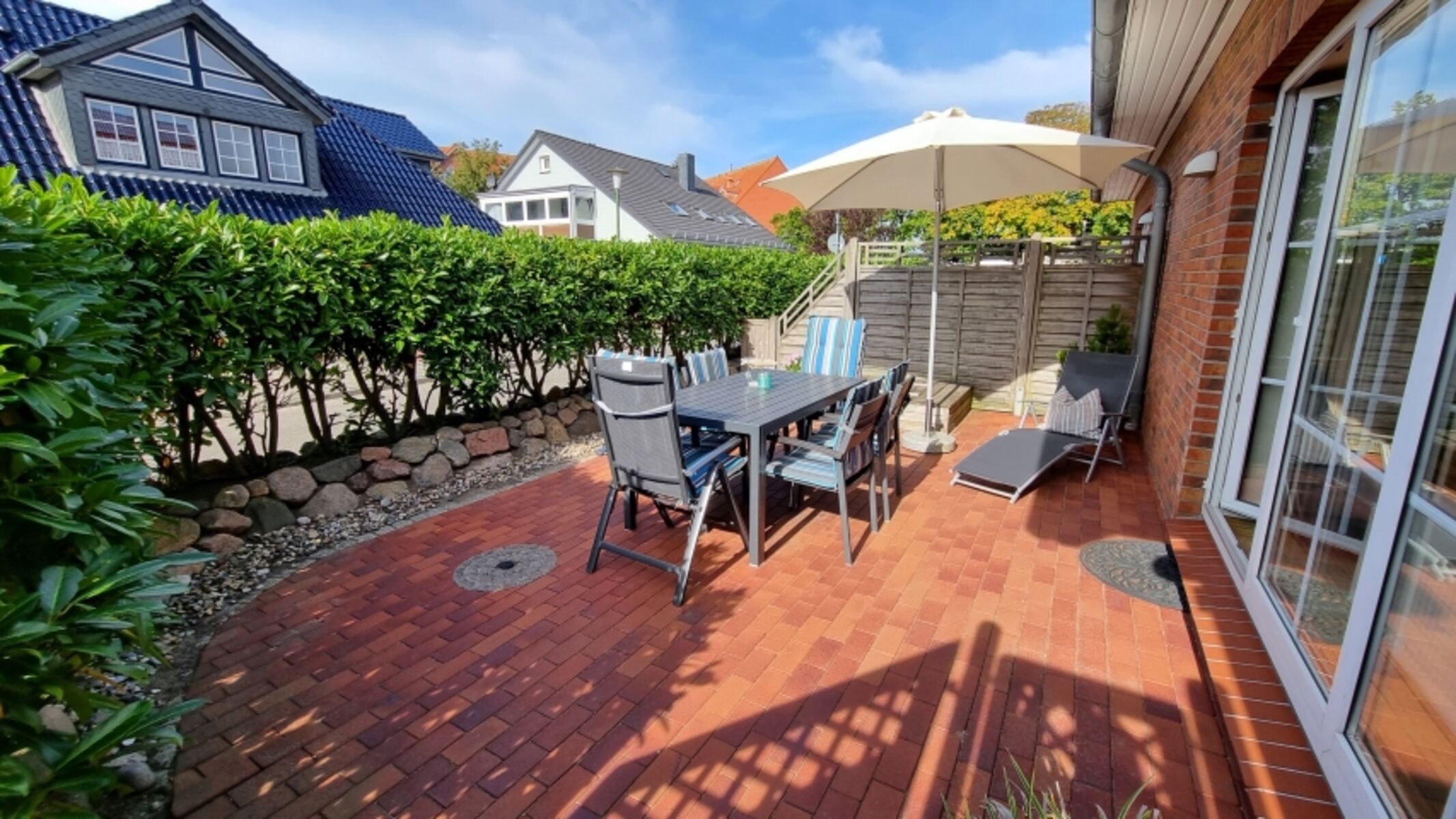 Garten und Terrasse: Tisch / 8 Stühle / Sonnenschirm / Holzkohlegrill / Liegestuhl