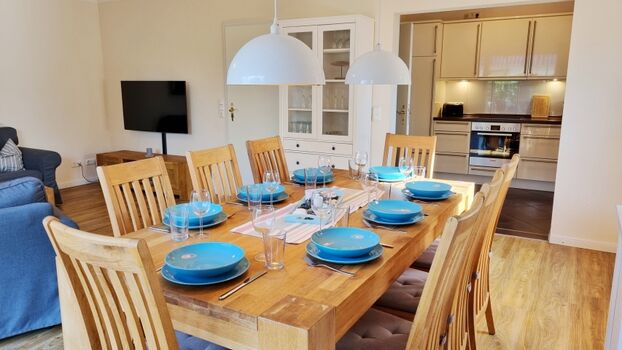 Wohn- Essbereich: Dreisitzer-Sofa / Zweisitzer-Sofa / Sessel / Fernseher / Esstisch / 8 Stühle / Vitrine / Kommode