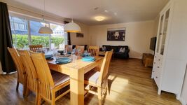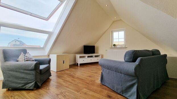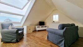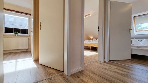 Im Erdgeschoss befindet sich neben einem großzügigen Wohn-/Essbereich auch eine große Wohnküche, sowie eines der beiden Duschbäder und der Abstellraum. Über die Eichenholztreppe gelangt man in den ersten Stock, mit drei von den vier Schlafzimmern, zwei davon mit Doppelbetten ausgestattet und eins mit 2 Einzelbetten. Des Weiteren befindet sich hier auch das zweite Duschbad mit zusätzlicher Badewanne. Im obersten Stockwerk besticht das vierte Schlafzimmer mit einem Doppelbett, einer Couchecke für einen abendlichen TV-Abend und dem tollen Blick auf die Ostsee durch das große Dachfenster.