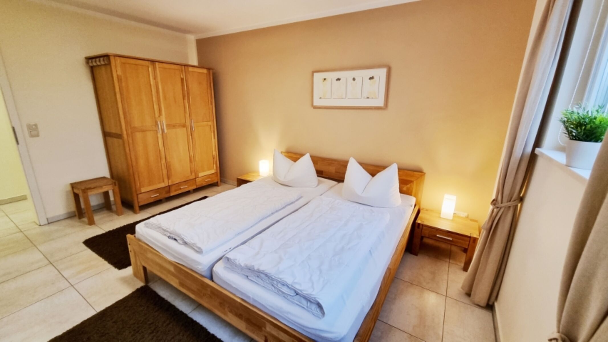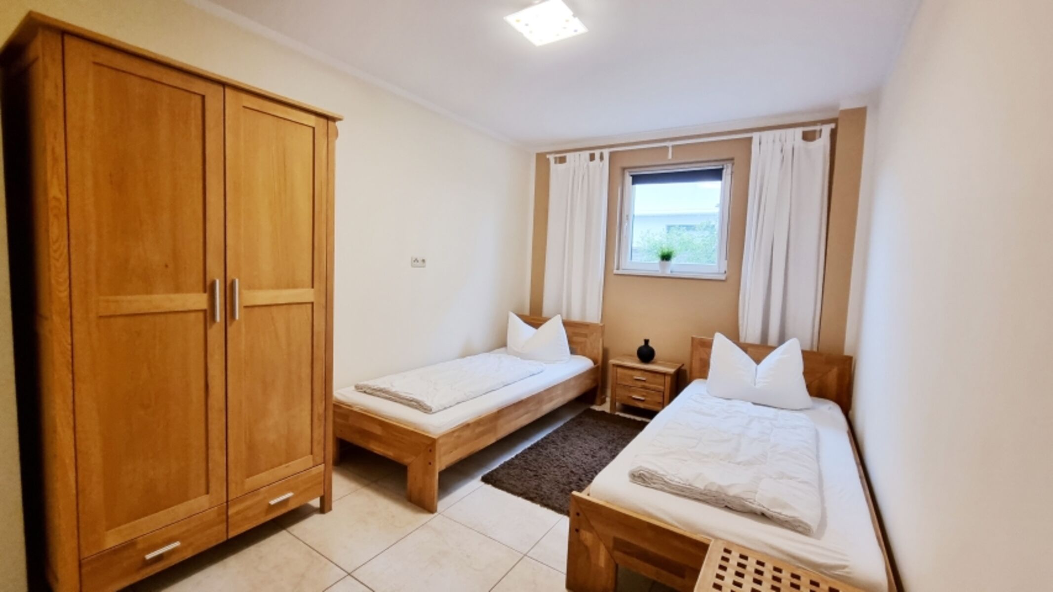 Schlafzimmer II: 2 Einzelbetten (90x200cm) / Kommode / Gardinen / Rollo / Fliegengitter