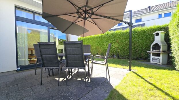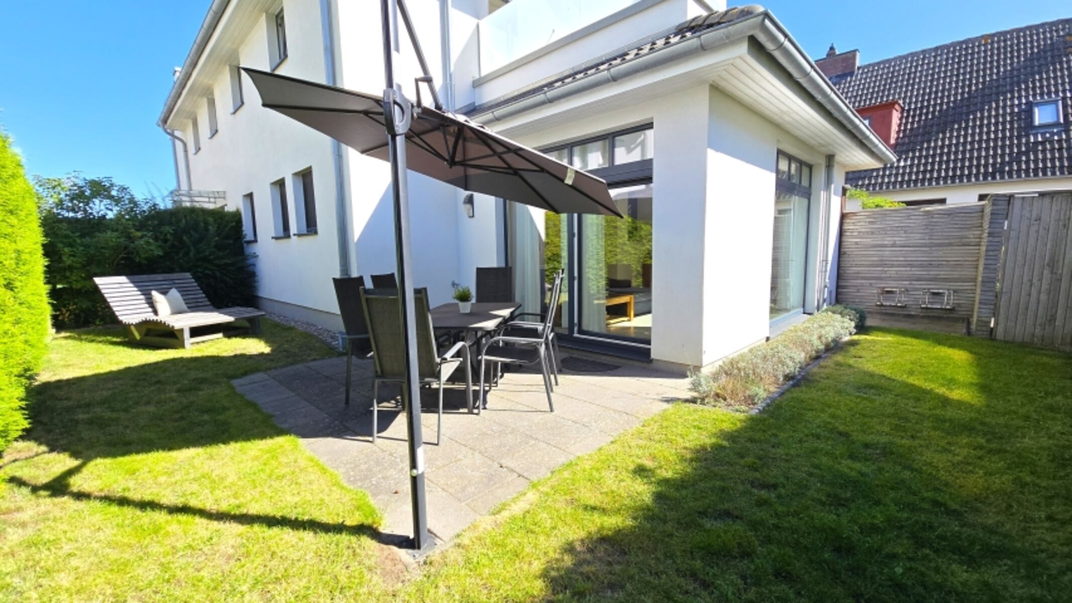 Die zugehörige Terrasse nebst 150qm eingezäuntem Garten, lädt zum Ostseeluft schnuppern und draußen sitzen ein. Von hier lässt sich wunderbar die Seele baumeln und dabei das Meer rauschen hören. Und das Beste, zur Ostsee sind es fußläufig gerade einmal ca. 30m