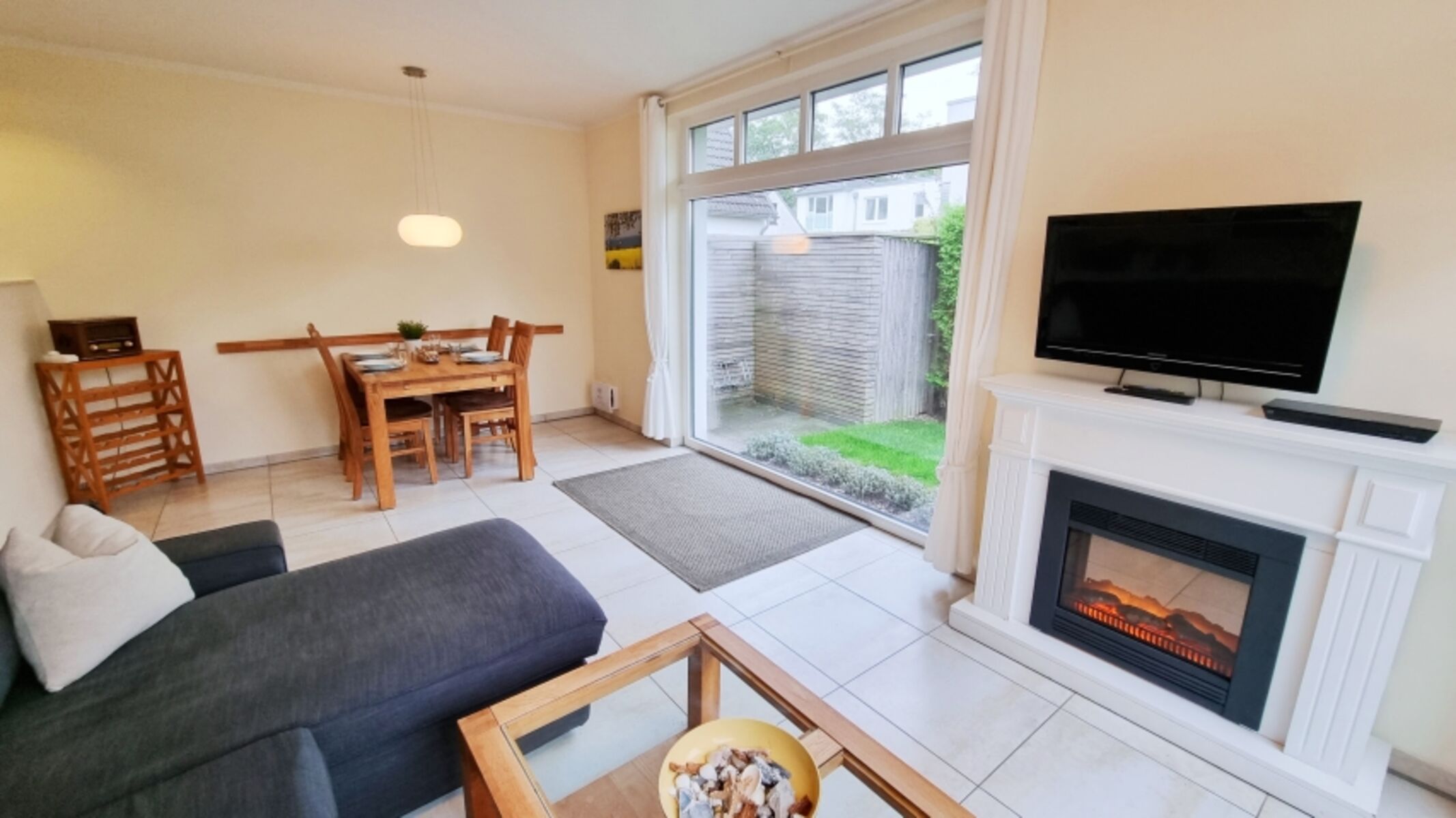 Wohn- Essbereich: große L-Couch / Fernseher / elektrischer Kamin / Esstisch / 4 Stühle