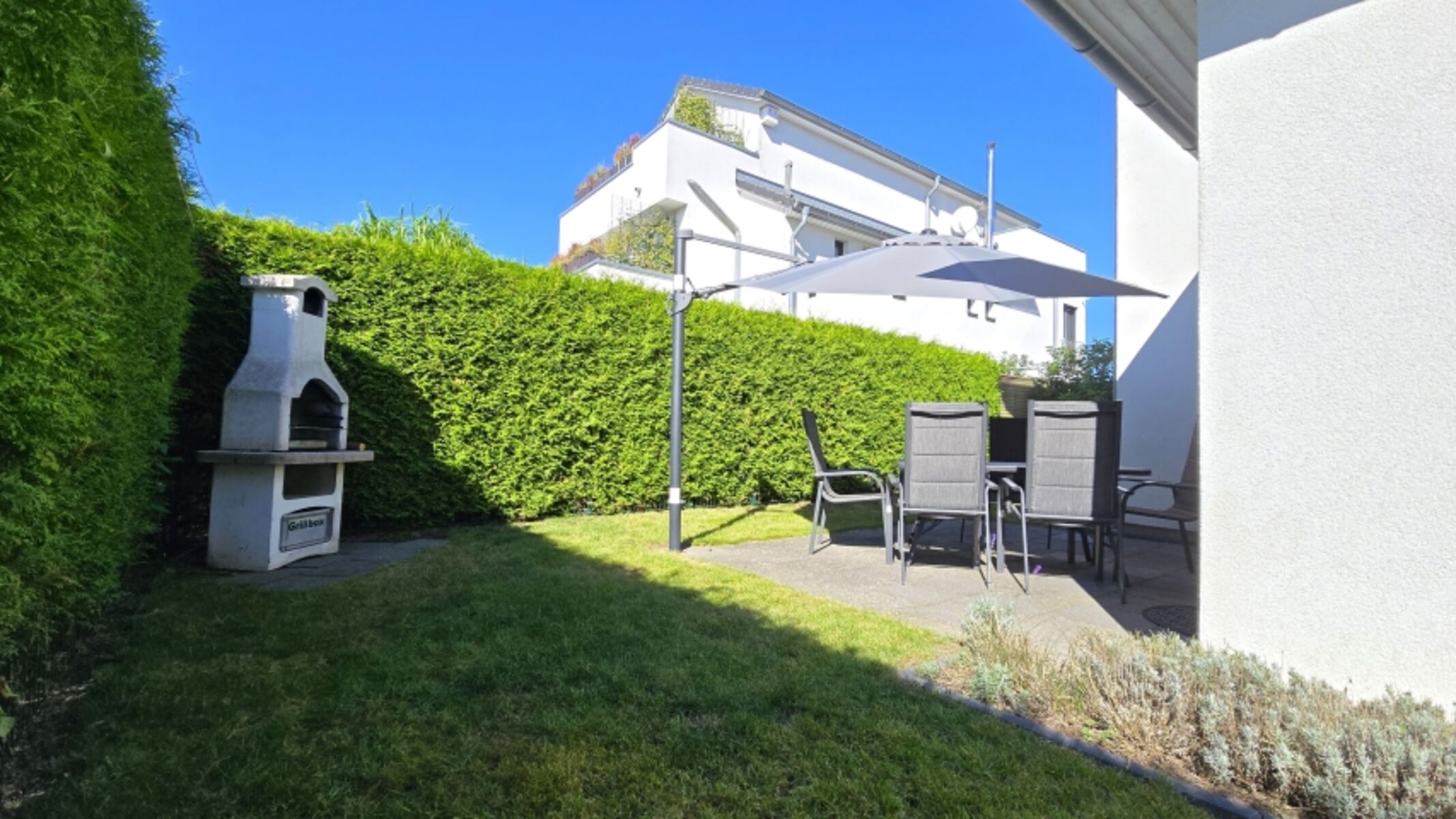 Garten und Terrasse: Tisch / 6 Stühle / Sonnenschirm / Holzkohlegrill / feste Wellenliege (120cm breit) / eingezäunt und eingewachsen