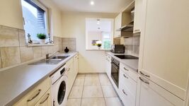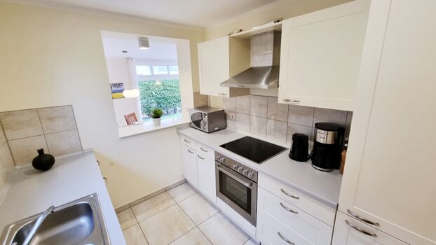 Küche: helle Küche / Cerankochfeld / Dunstabzugshaube / Backofen / Geschirrspüler / Mikrowelle / Toaster / Filterkaffeemaschine / Senseo Kapselmaschine / Wasserkocher / Kühlschrank / separierter halber Gefrierschrank mit 3-Fächern