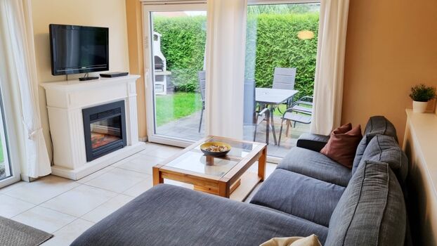Für Gemütlichkeit, vor Allem in der kalten Jahreszeit, steht unter dem TV gegenüber der Couch ein elektrischer Kaminofen mit Kaminfeuerillusion bereit.