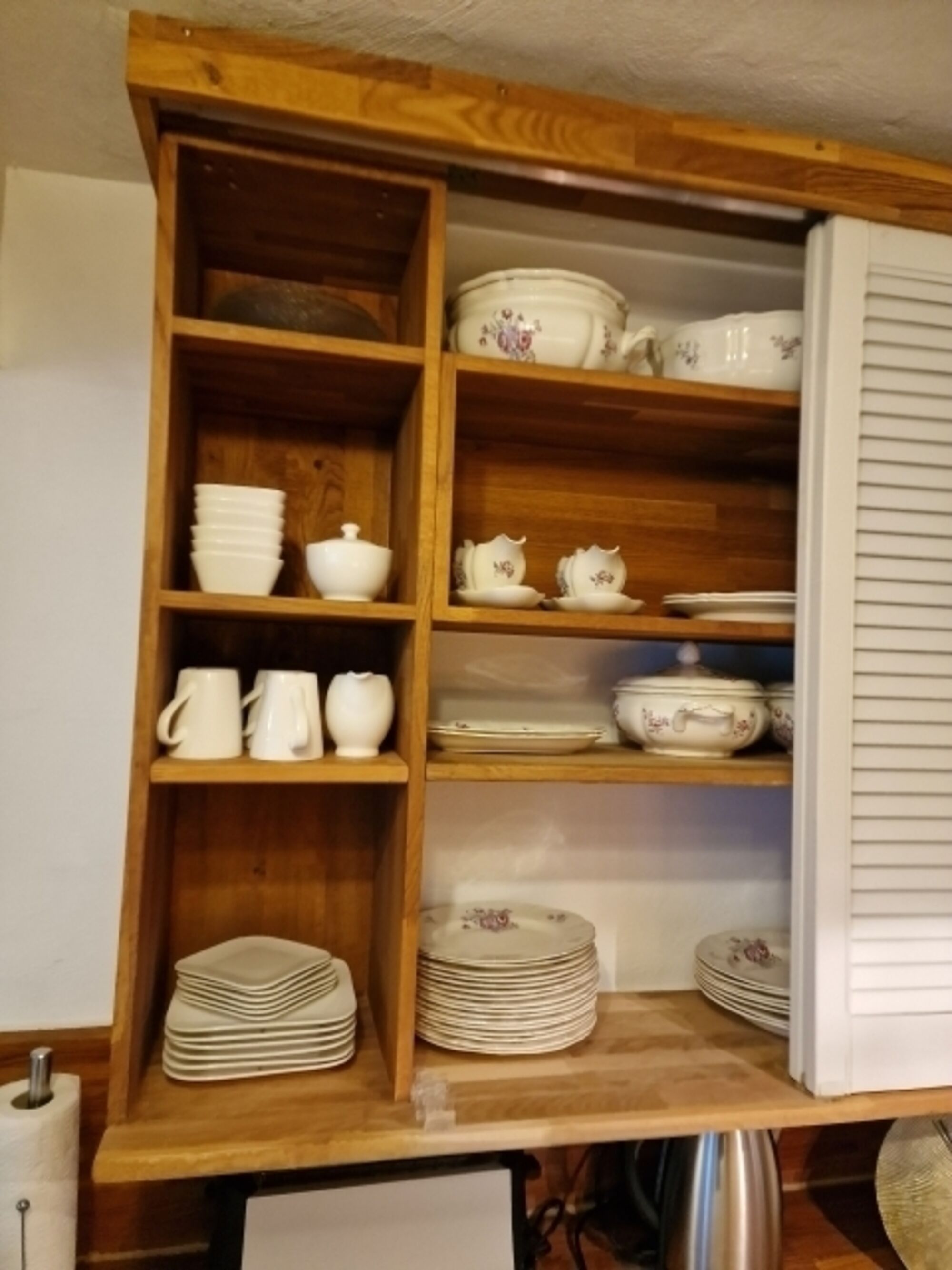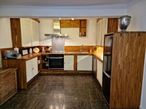 -- Massivholzküche mit Spülmaschine, Mikrowelle, Kühl- und Gefrierschrank