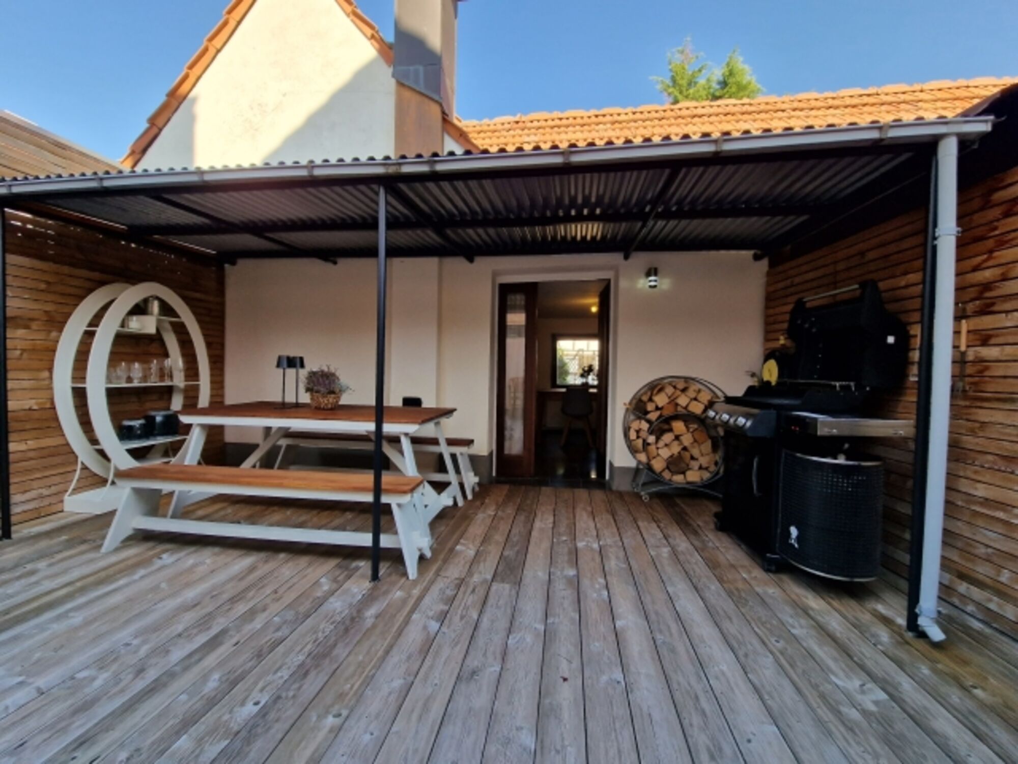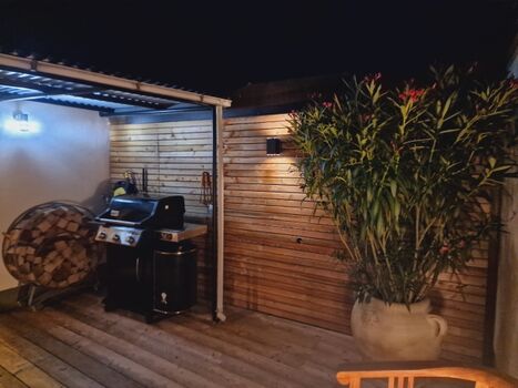 -- Uneinsehbare teilüberdachte Terrasse mit Sitzgelegenheit und Weber-