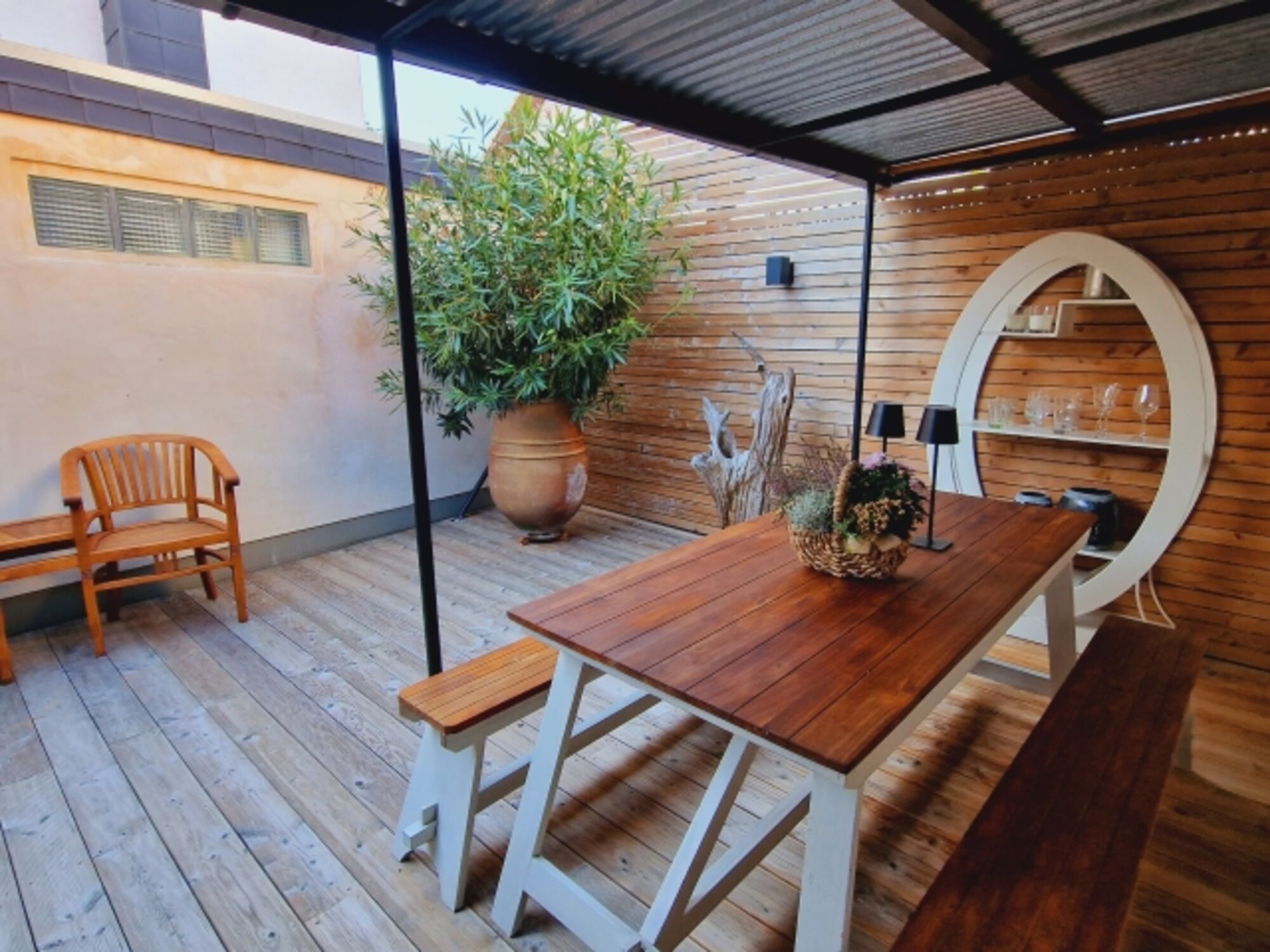 Von hier hat man direkten Zugang zur üppig begrünten teilüberdachten Holzterrasse. In diesem uneinsehbaren Aussenbereich können Sie beim Grillen und einem Gläschen Wein herrlich entspannen .
