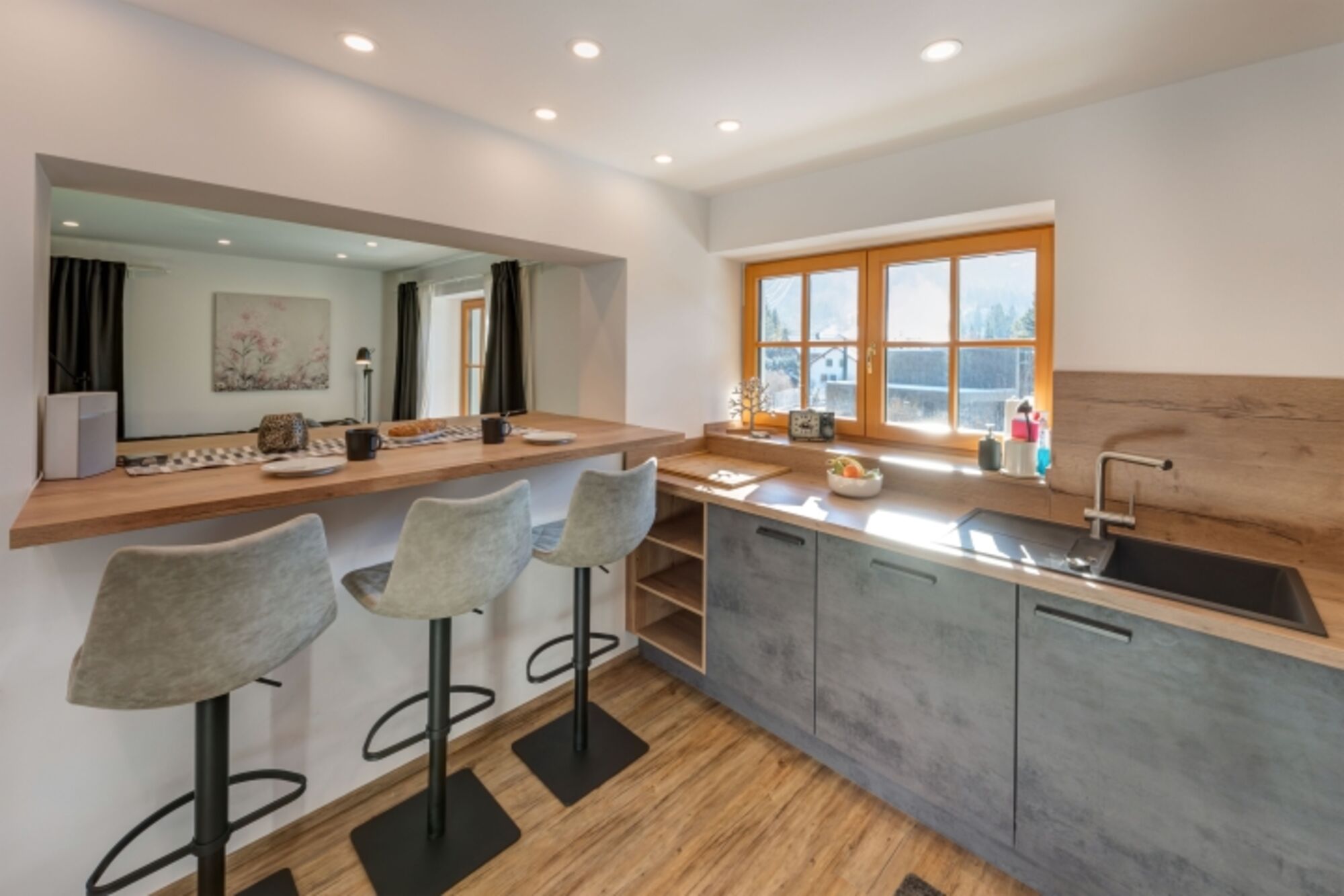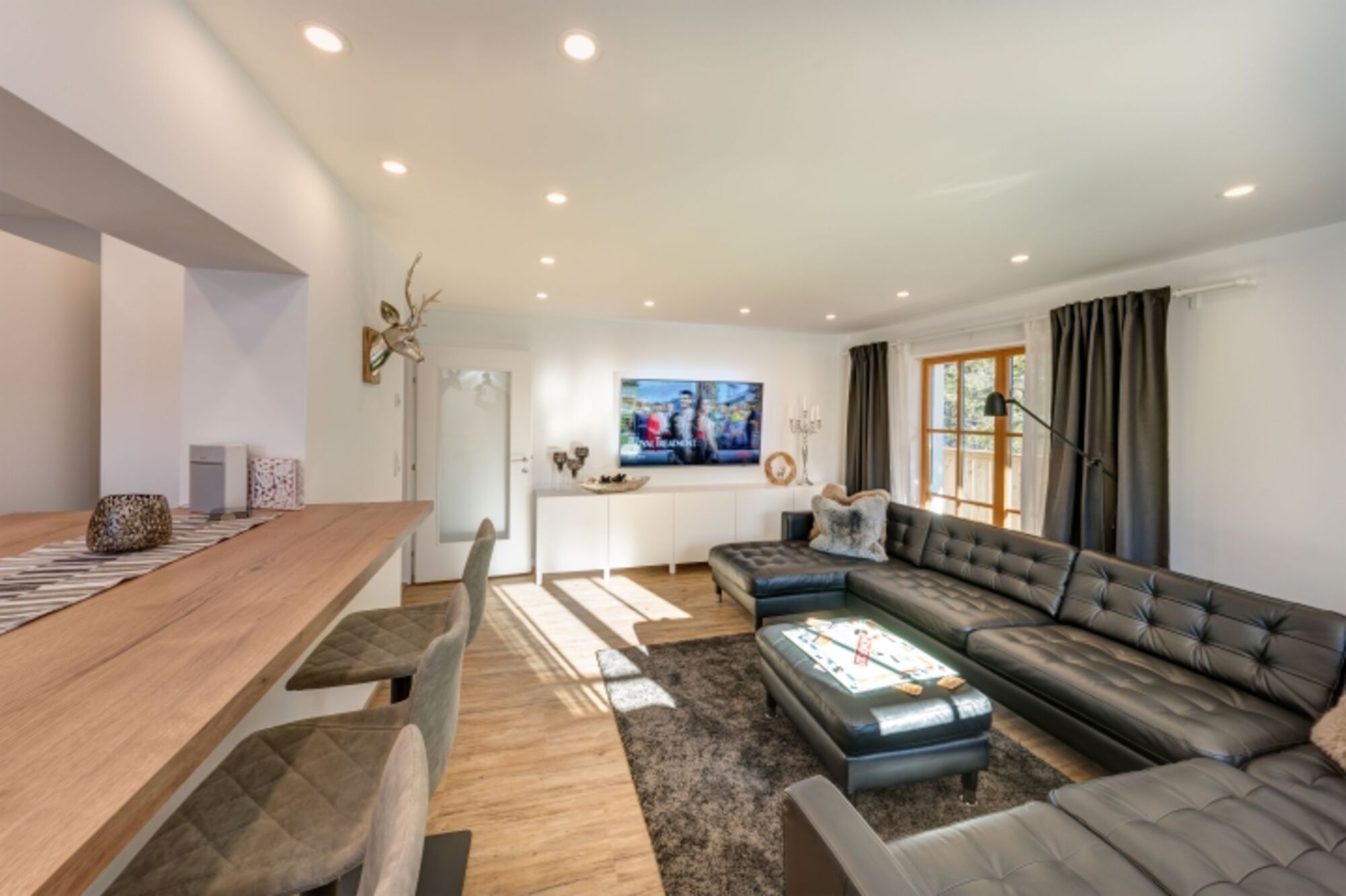 Die Verbindung von Küche zum Wohnzimmer – jetzt neu auch hier ein LED-Kamin – mit dem großen Bar-Esstisch und den gemütlichen Hockern gibt ein wunderbar luftiges und helles Wohnerlebnis.