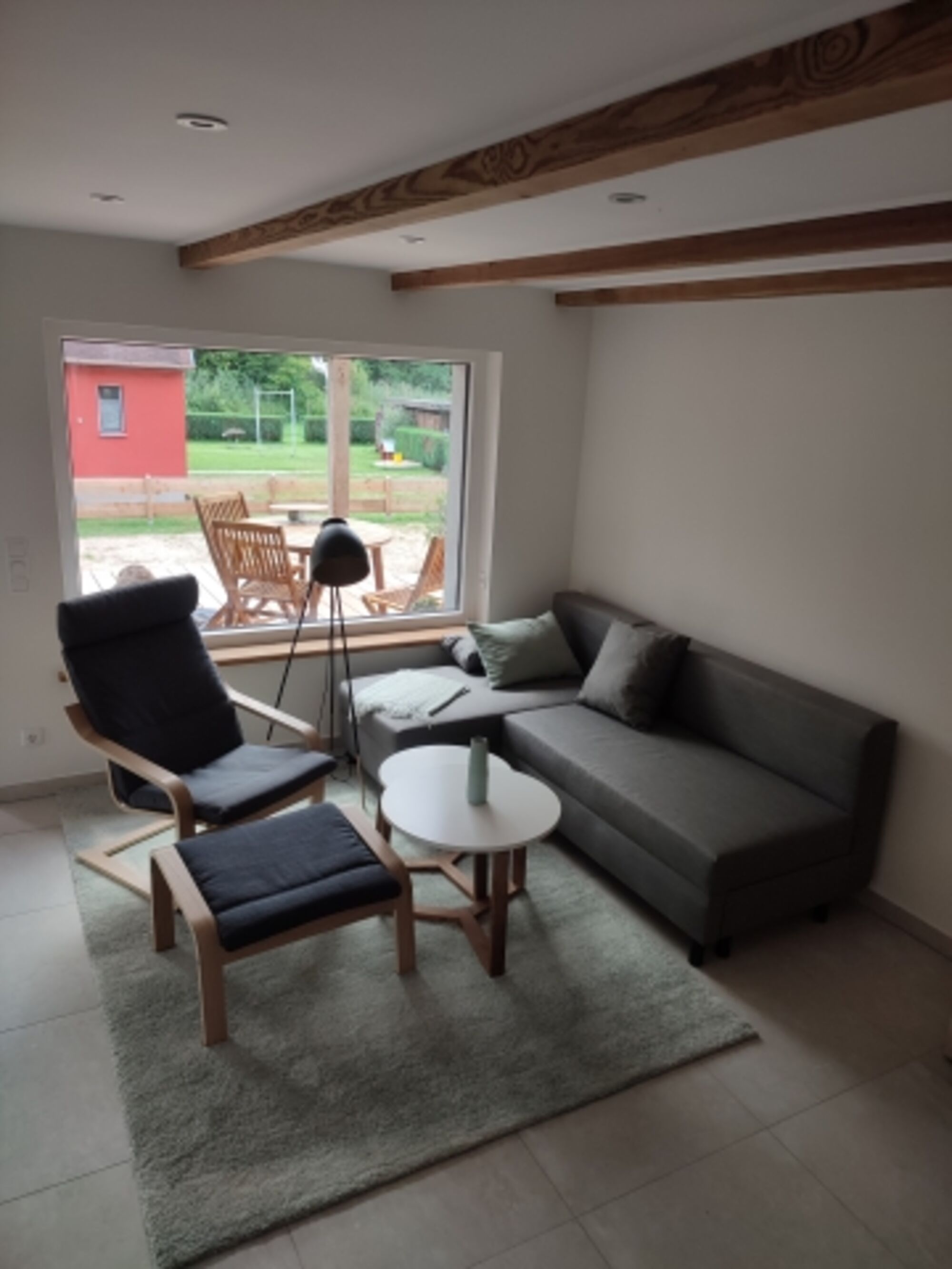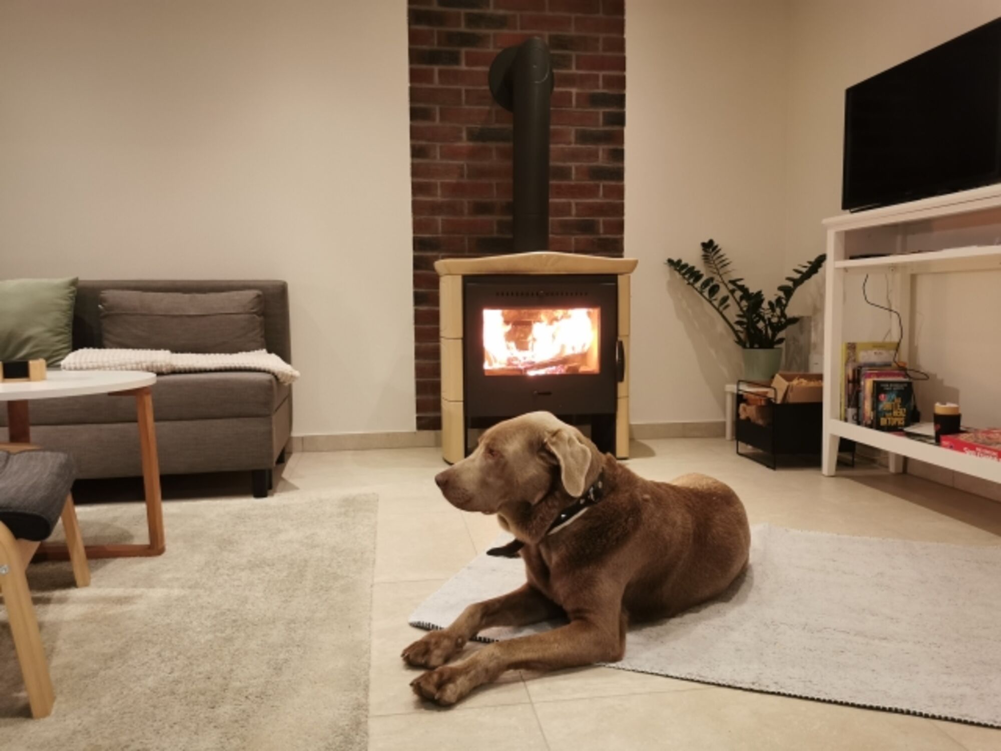 SMART-TV, Bücher, Kaminofen, Eckcouch, Sessel, Fliegengitter