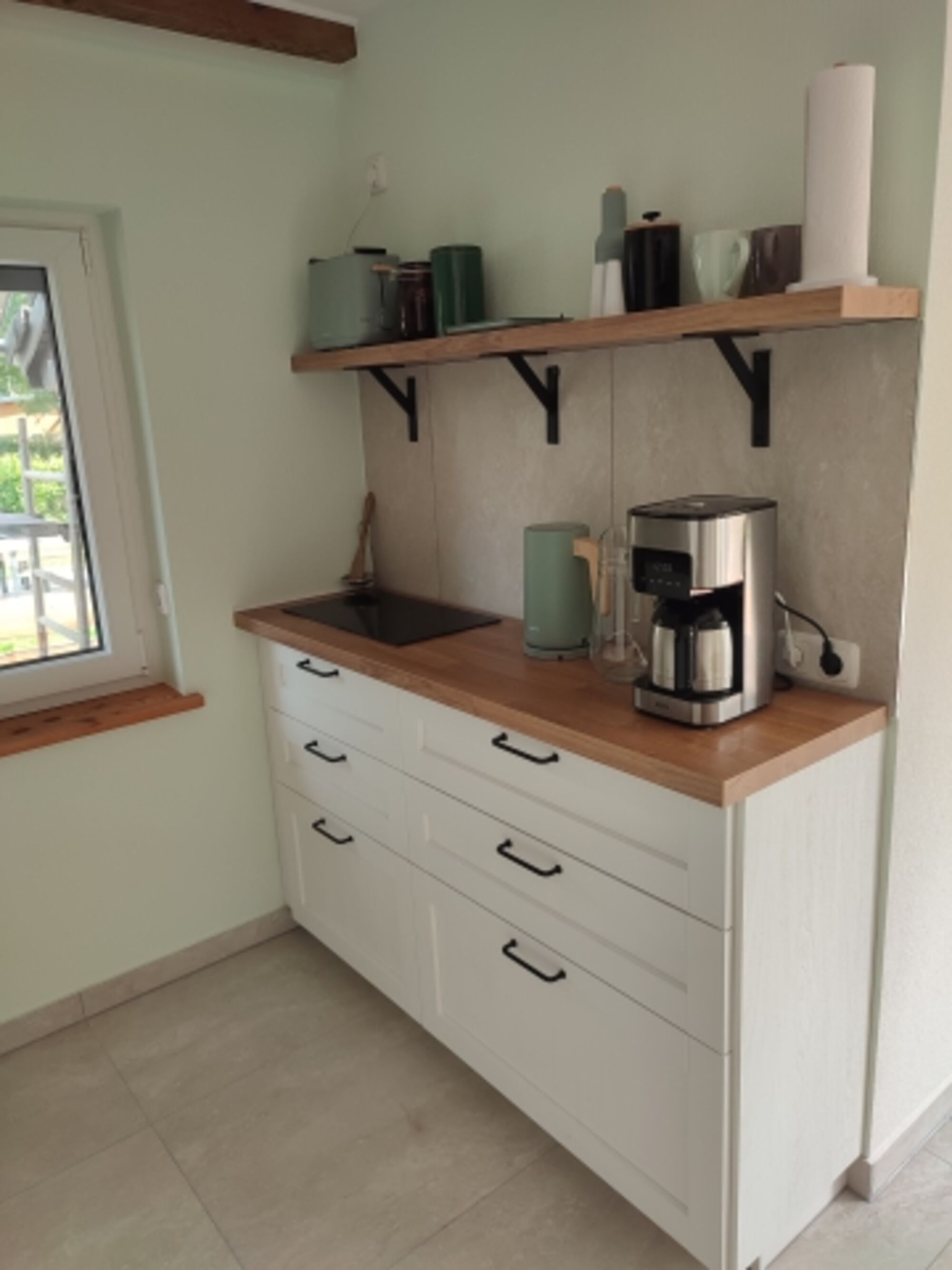 Induktionsherd, Kühlschrank mit Gefrierfach, Küchenmaschine, Mixer, Korkenzieher / Flaschenöffner, Gewürze (Salz, Pfeffer, Zucker), Öl / Essig, Geschirrhandtücher, Mülltüten
