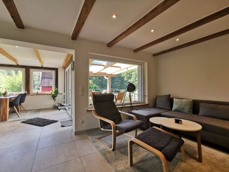 Das Ferienhaus - 2023 vollständig saniert - ist mitten in einer Waldlichtung und ruhigen Gegend. Kamin, Wintergarten, Terrasse und großer Garten laden zu einem entspannten, naturnahen Urlaub ein, für Mensch und Tier.