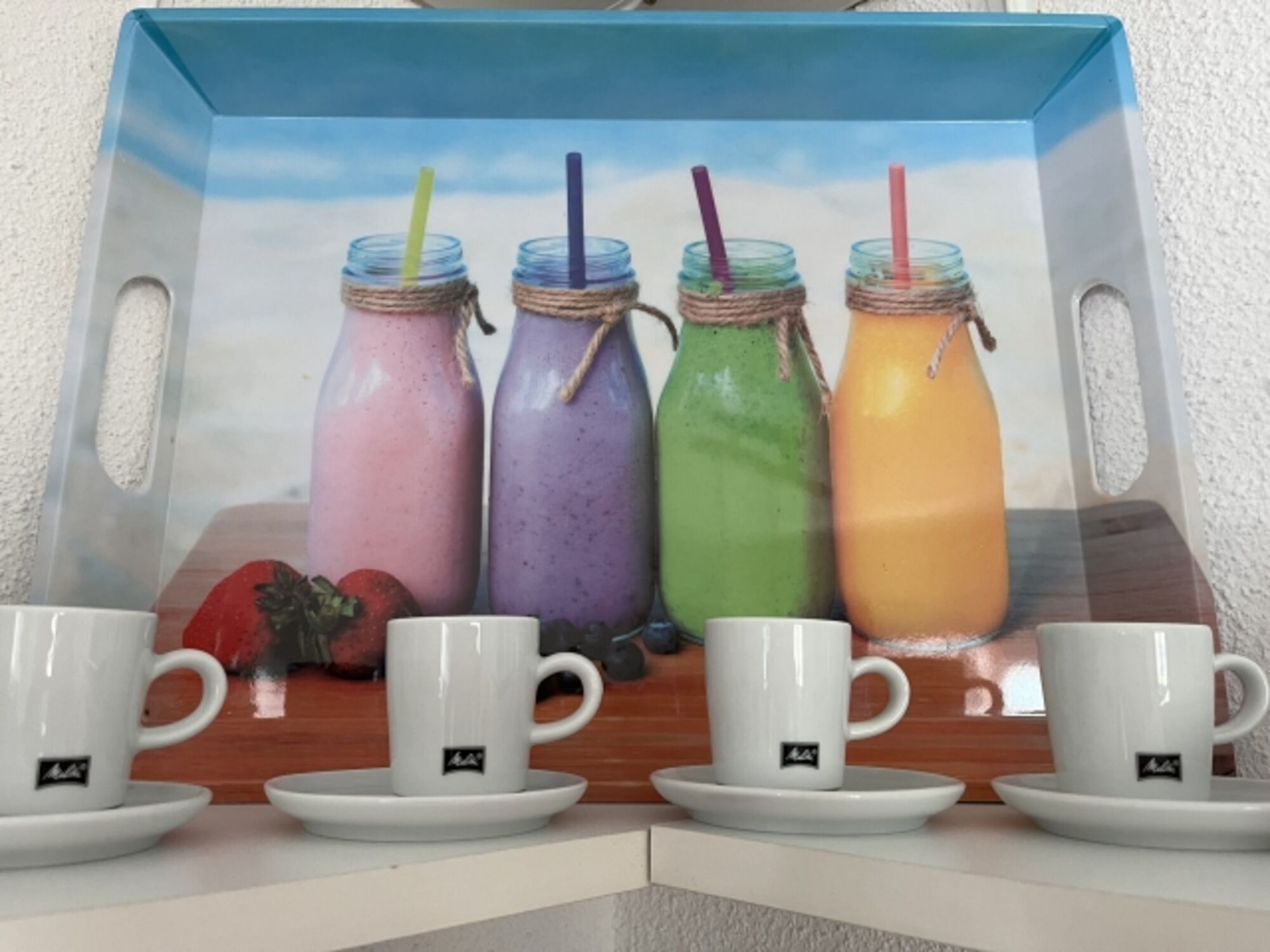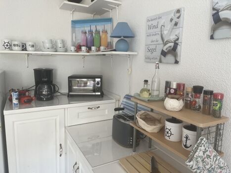 2-Platten Herd, Kühlschrank mit Gefrierfach, Korkenzieher / Flaschenöffner, Gewürze (Salz, Pfeffer, Zucker), Öl / Essig, Geschirrhandtücher, Mülltüten, Essplatz in der Küche