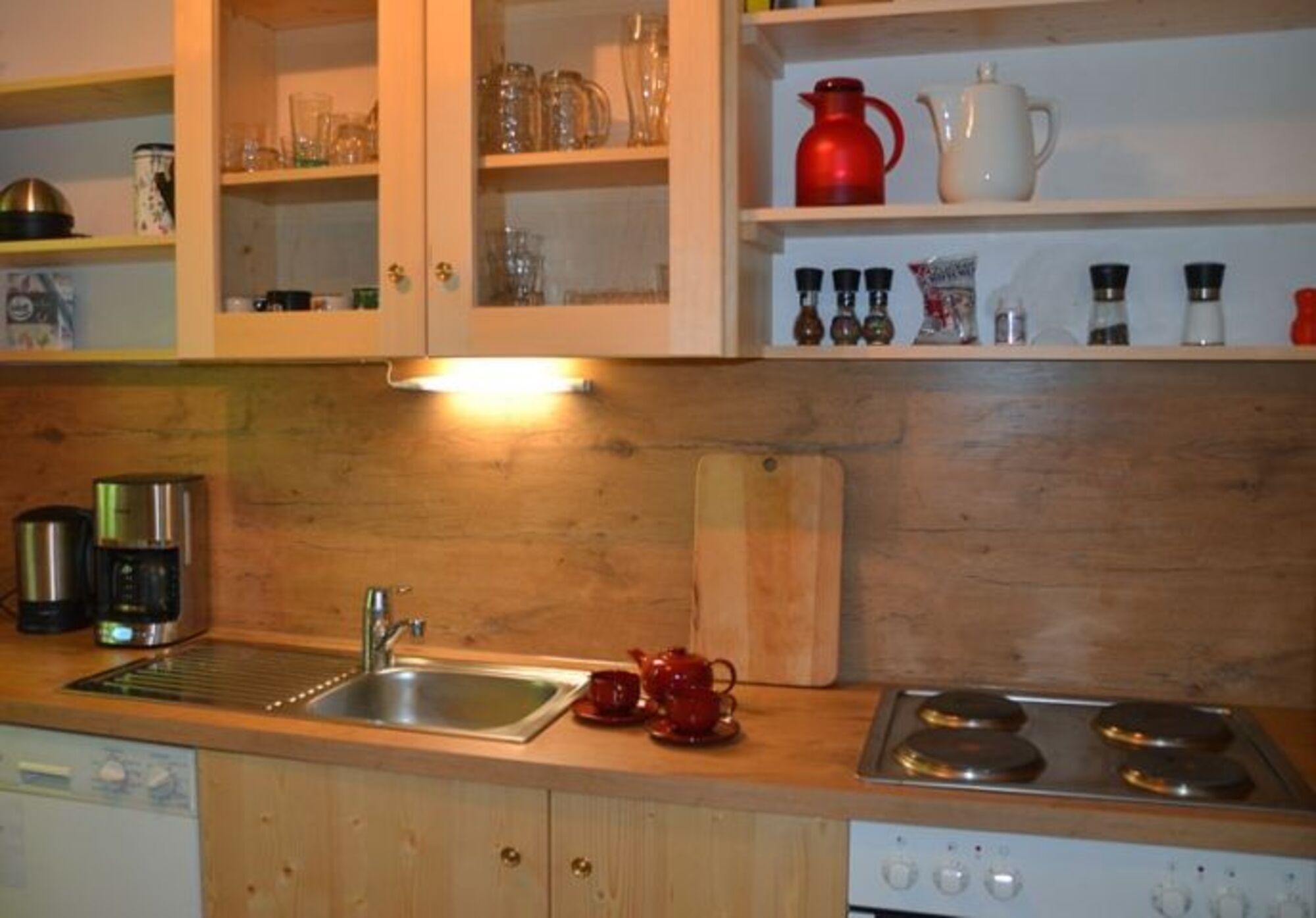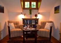 Im Parterre sind ein Aufenthaltsraum mit großem Esstisch, ein kleiner Aufenthaltsraum mit Sitzecke und Fernseher, ein Schlafraum mit Doppelbett, Bad, WC sowie eine voll ausgestattete Küche mit Spülmaschine, Mikrowelle, Vierplatten-Herd und Backofen.