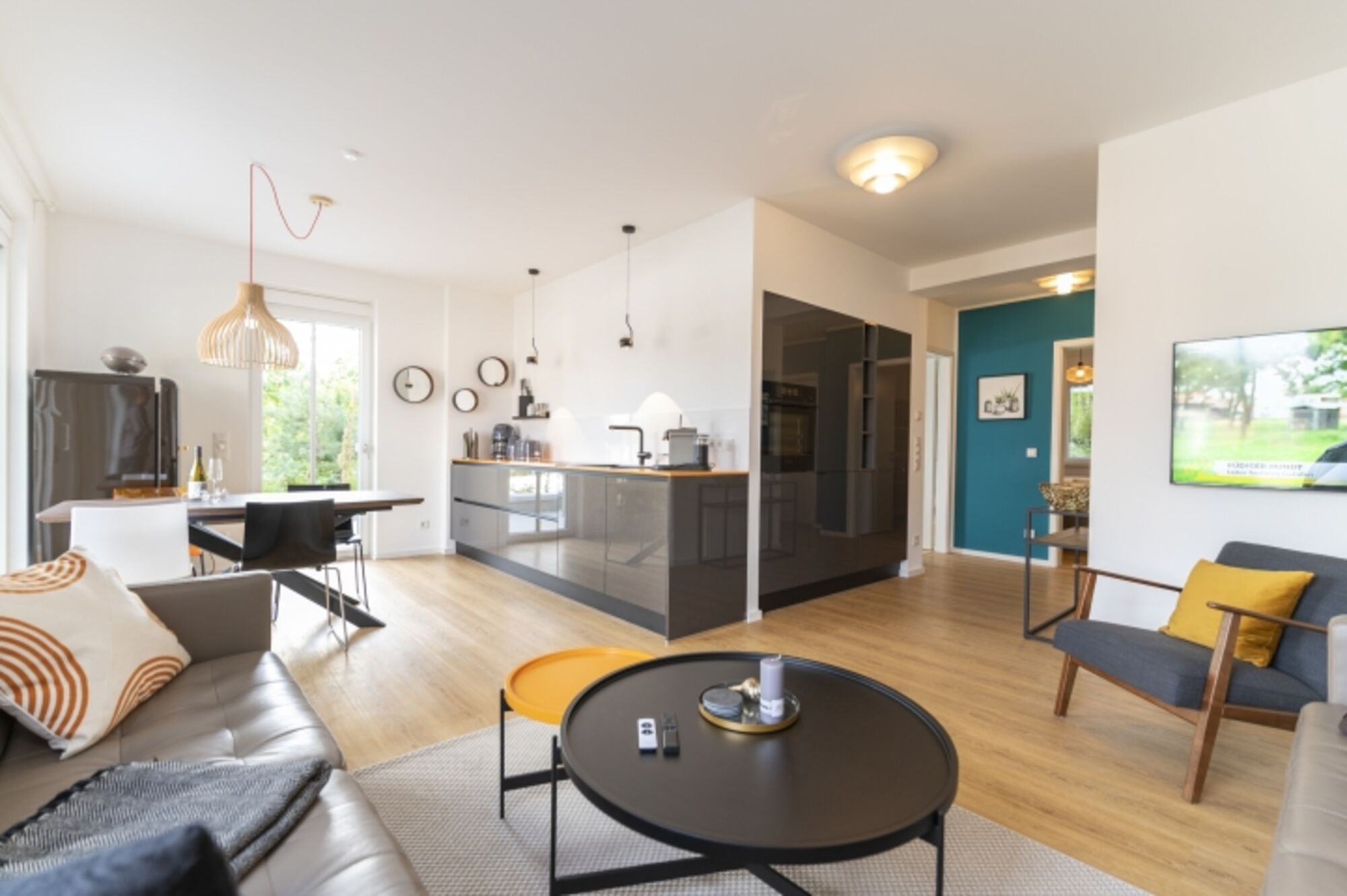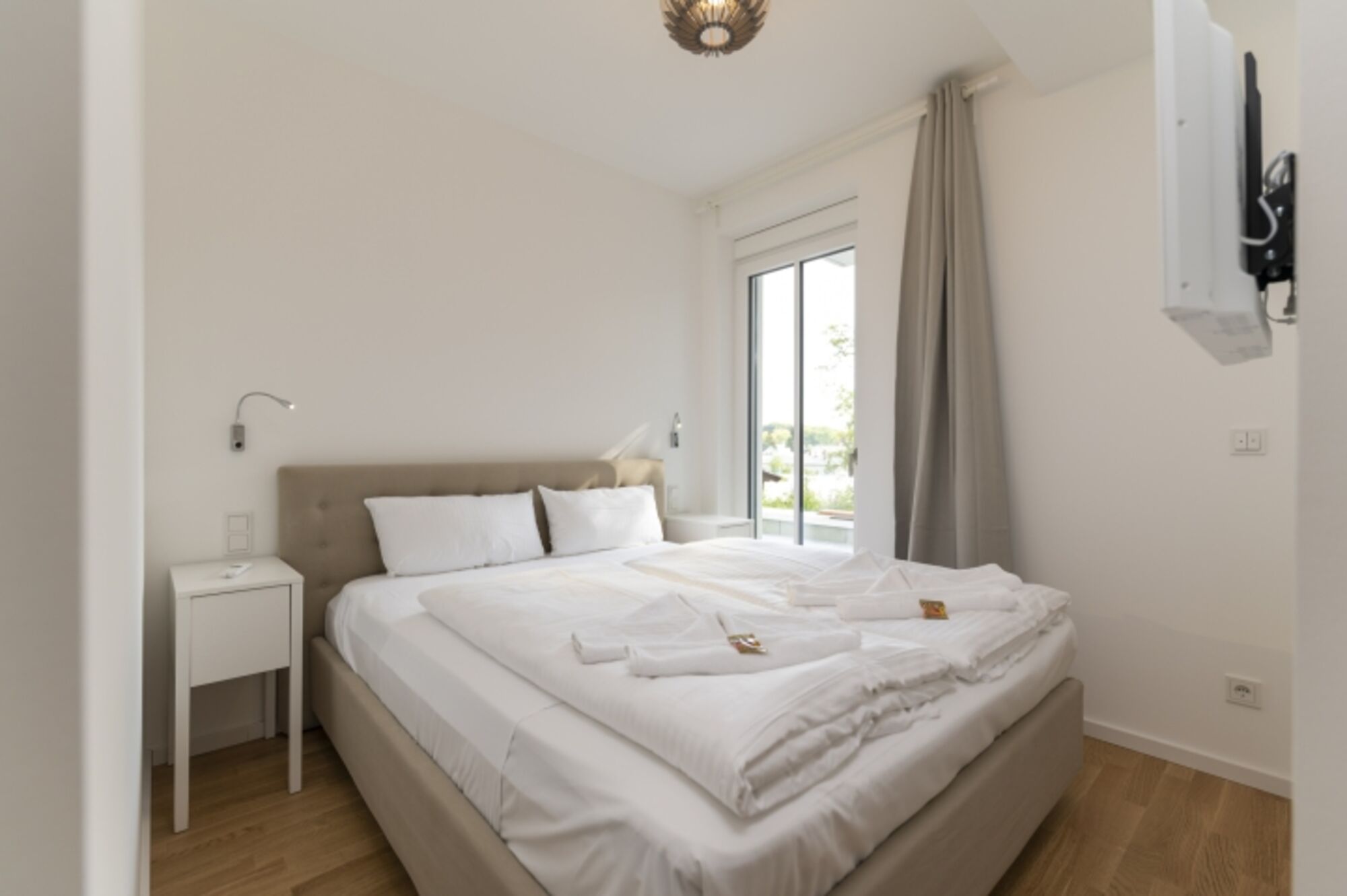 Auf 73 Quadratmetern erwartet Sie in diesem wunderschön eingerichteten Appartement ein exklusives Urlaubsdomizil. Drei Zimmer in modernem Design – hier können Sie mit bis zu vier Personen einen unvergesslichen Usedom-Urlaub erleben. Auch ihr Vierbeiner ist hier ein willkommener Gast. Es empfängt Sie ein offenes und großzügiges Wohn-Esszimmer, das viel Platz zum Durchatmen und Energietanken bietet. Ein echter Hingucker ist die vollausgestattete Küchenzeile mit Borakochfeld. Ein großer Essplatz lädt zum gemeinsamen Genuss ein. Im großen Küchenschrank befindet sich eine Waschmaschine. Die beiden Schlafzimmern sind jeweils mit Boxspringdoppelbetten und je einem Flat-TV ausgestattet. Das zweite Schafzimmer hat einen begehbaren Kleiderschrank und ist verbunden mit einem großen Badezimmer. Das Highlight hier ist die wunderschöne Dusch-Rückwand. Das andere Badezimmer hat auch eine große Dusche und einen großen Waschtisch mit Spiegel. Wlan ist in der Wohnung verfügbar. Die große umlaufende Terrasse bietet immer einen Schattenplatz oder wer möchte auch viel Sonne.