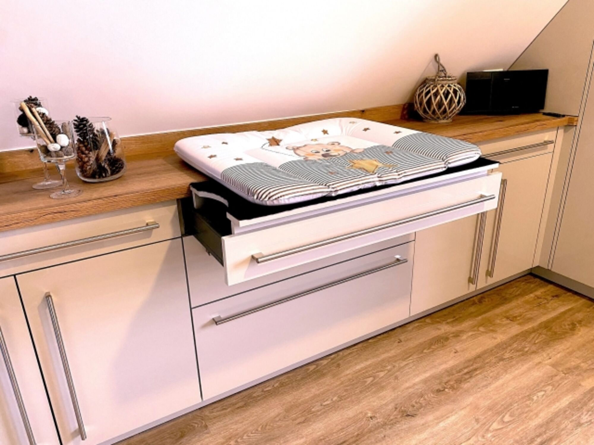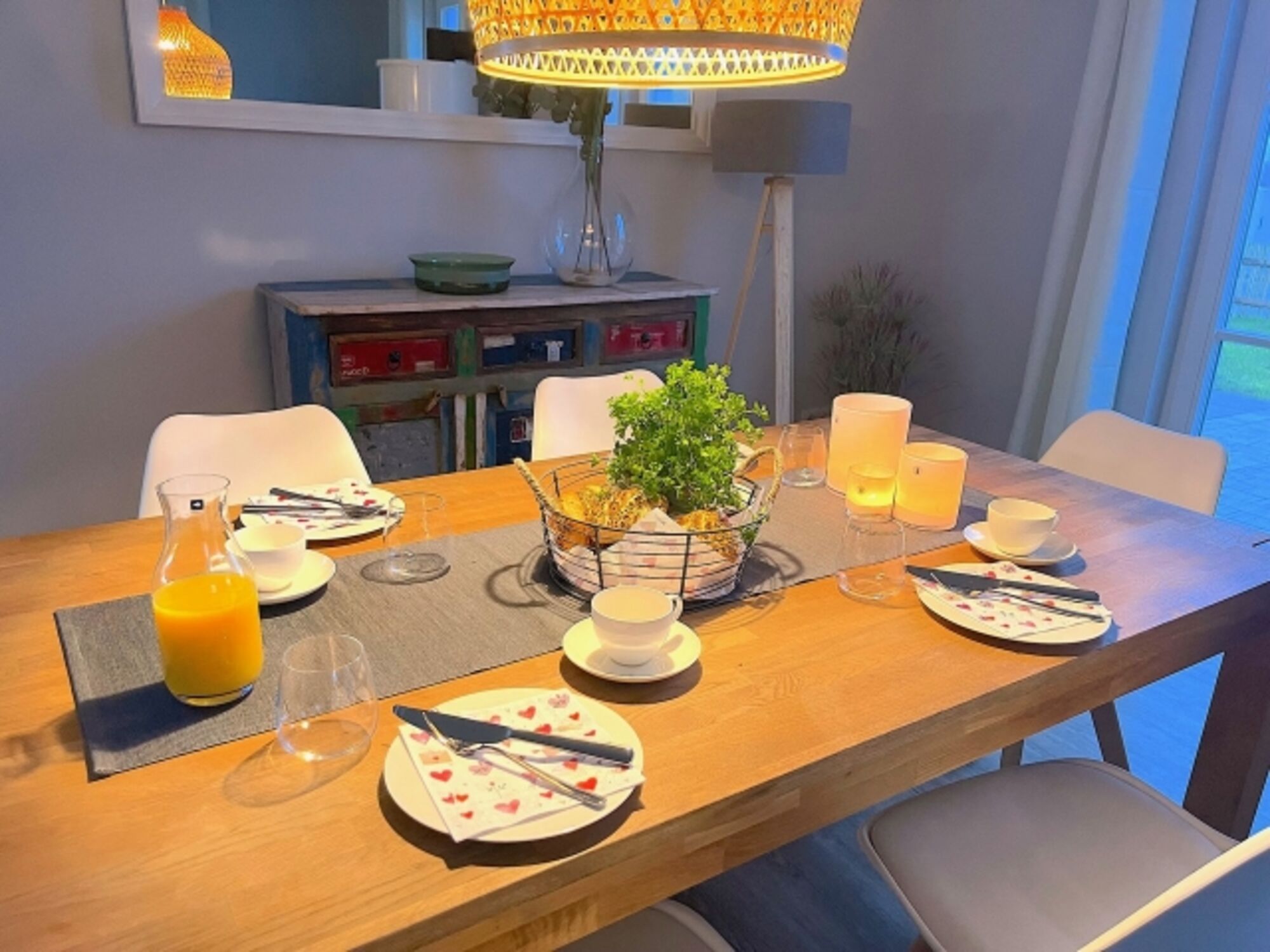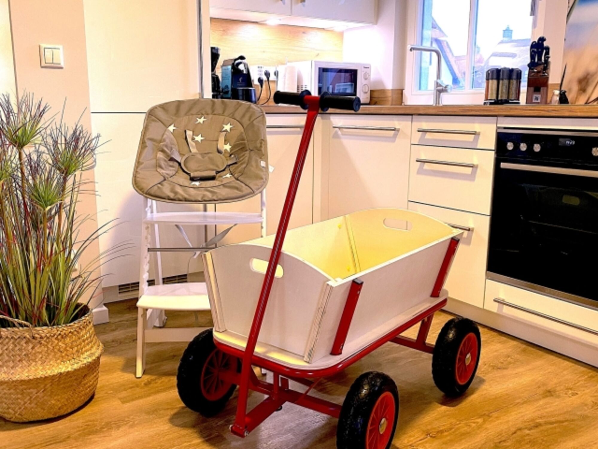 Für die Sicherheit der kleinen Strandpiraten ist gesorgt. Ein Wickeltisch ist im Sideboard des Master-Schlafzimmers integriert. Und zusätzliche Multimedia-Steckdosen mit jeweils 3 USB Ports und 1 Typ-C Port mit Kindersicherung sind in allen Schlafzimmern und in der Küche installiert. Im Ferienhaus stehen 2 Kinder-Hochstühle zur Verfügung, 1 davon auch für Säuglinge geeignet.