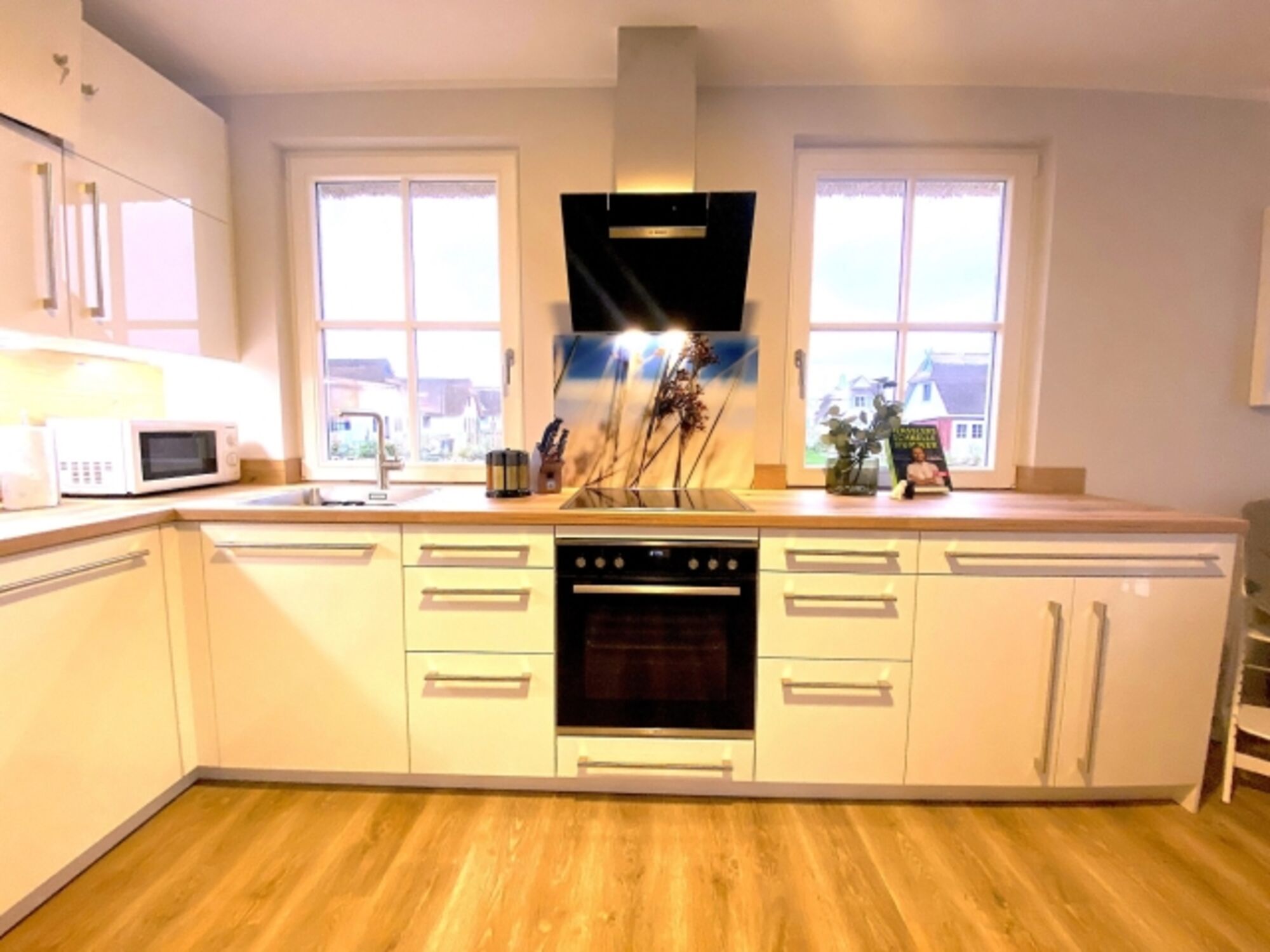 Cerankochfeld, Dunstabzugshaube, Gefrierschrank, Nespresso-Automat, Eierkocher, Küchenmaschine, Geschirrhandtücher, Mülltüten, Essplatz in der Küche