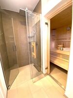Die bodengleiche Wellnessdusche ist im Saunabereich integriert. Ein Gäste-WC und der HWR mit Waschmaschine, Trockner und Haushaltsartikeln runden das Angebot im Erdgeschoss ab.