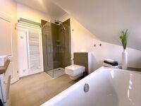 Im Obergeschoss befinden sich die 3 Schlafzimmer und das moderne Vollbad mit Fledermausgaube, Komfort-Badewanne und bodengleicher Dusche.