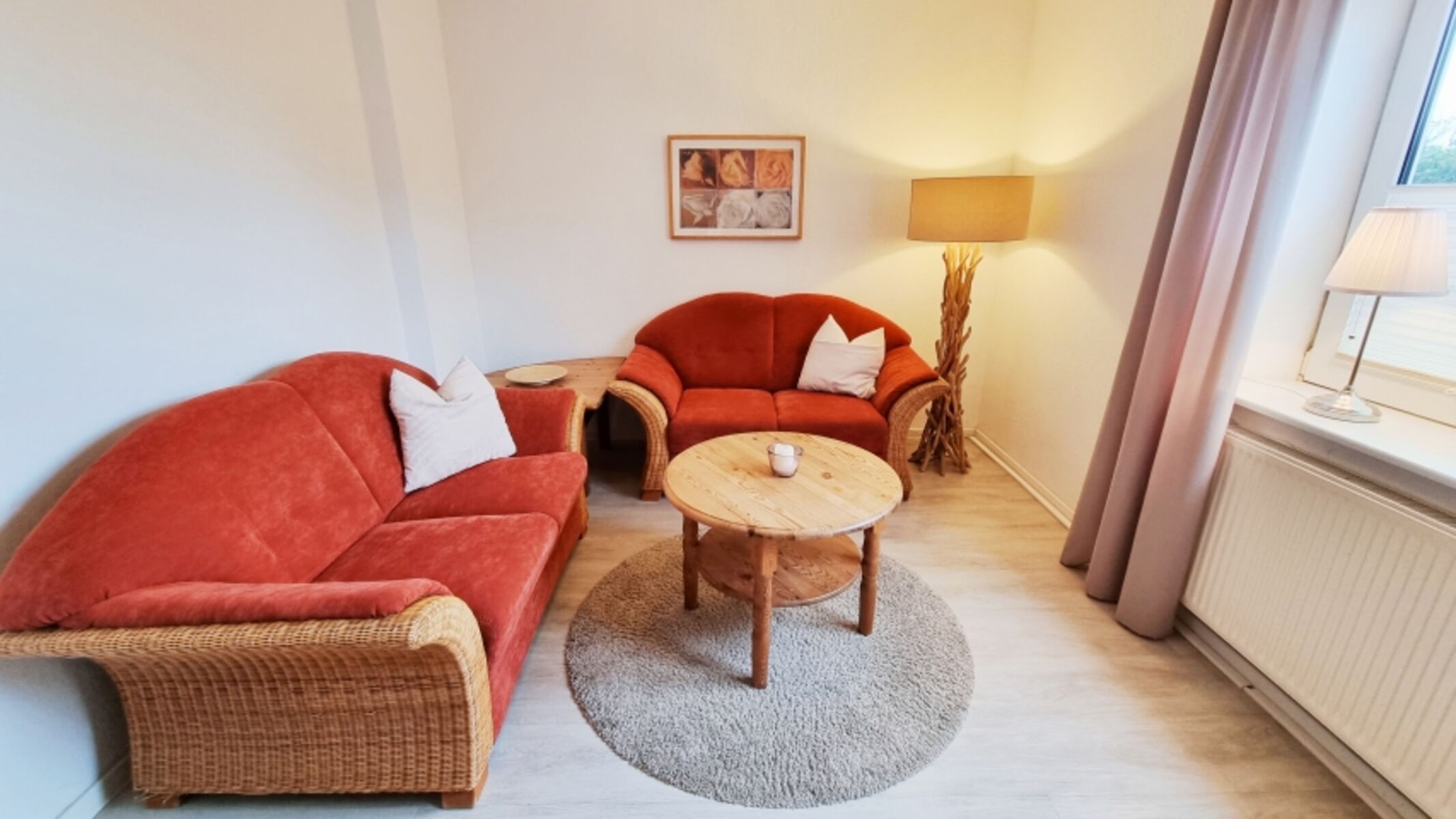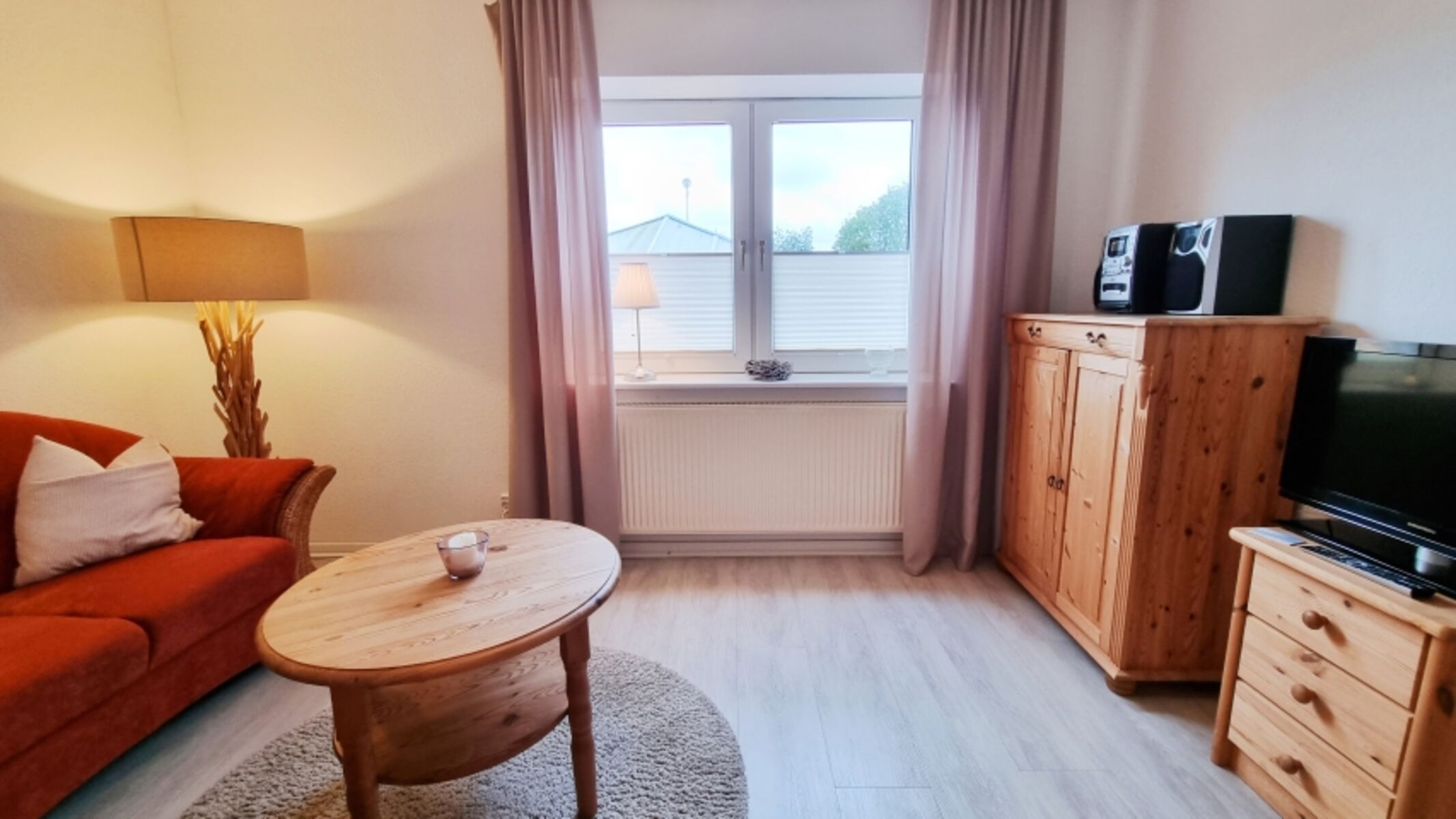 Wohnbereich: 2 Zweisitzer-Sofas / Fernseher / Kommode / Plissees