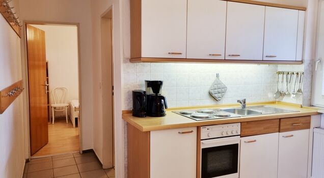 offene Küche: 4-Platten-Herd / Backofen / Mikrowelle / Toaster / Filterkaffeemaschine / Wasserkocher / Kühlschrank mit Gefrierfach