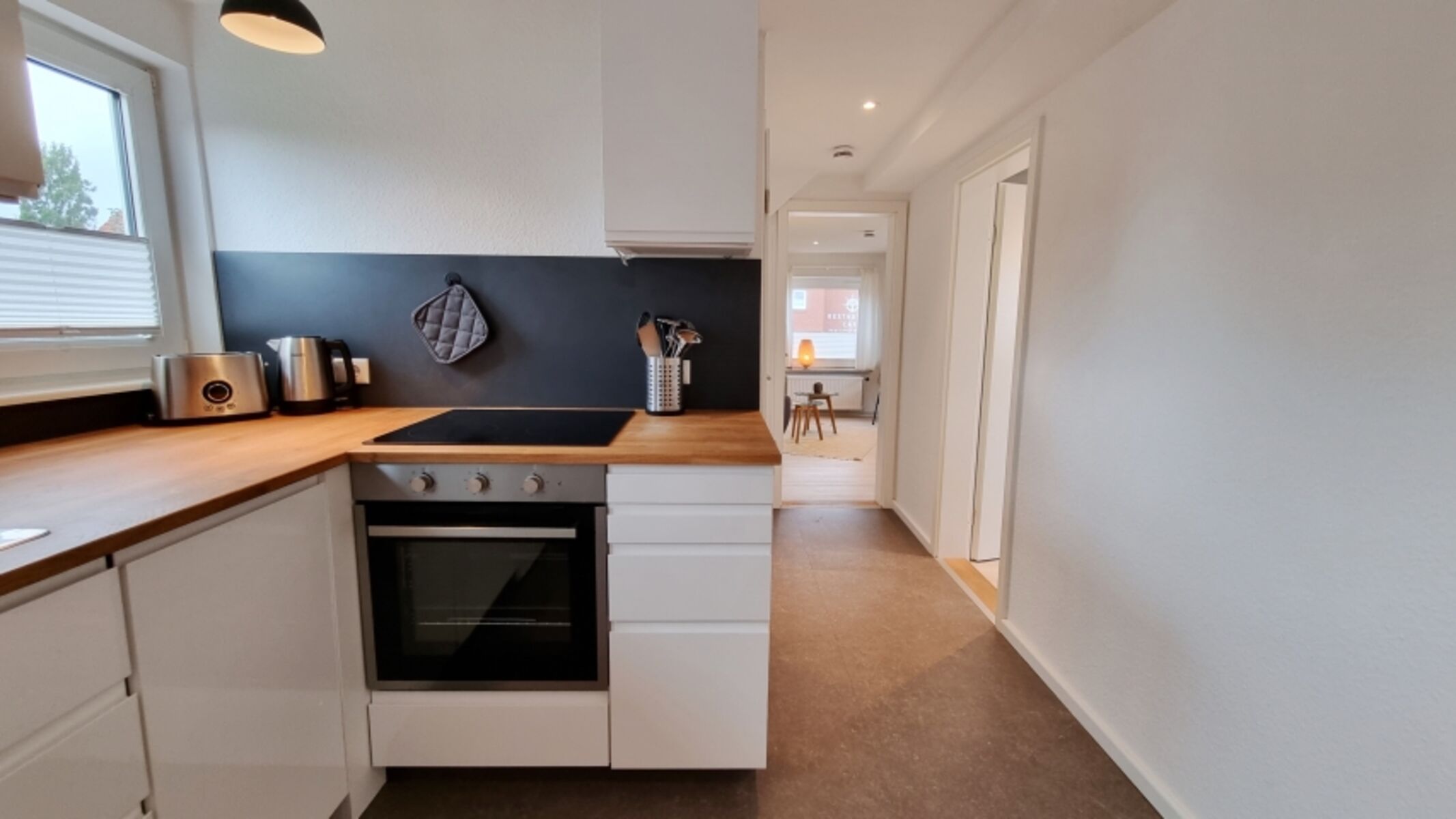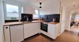 offene Küche: Cerankochfeld / Backofen / Toaster / Filterkaffeemaschine / Wasserkocher / Kühlschrank mit Gefrierfach