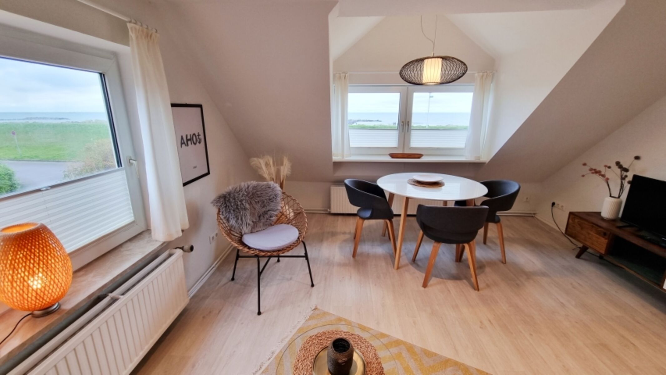 Wohn- Essbereich: Couch / Sessel / Fernseher / Kommode / Esstisch / 3 Stühle / Meerblick / Plissees