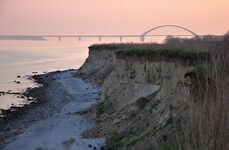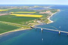 Genießen Sie die Ruhe auf der Terrasse im Garten mit Blick über die Felder auf die Fehmarnsundbrücke.